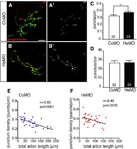 Figure 7. Hermes depletion causes an increase in synaptic punctum density. A–B′, Retinal axon terminals expressing GFP (green) and synaptophysin (red; syn-RFP) in the zebrafish tectum at 4 dpf. HeMO- or CoMO-injected embryos were coinjected with eGFP and syn-RFP, and the number of syn-RFP puncta was counted. C, D, HeMO-injected embryos showed a significant increase in density of synaptic puncta (puncta per square micrometer) (C), but no difference in the total amount of puncta (D). Error bars represent SEM. *p < 0.05, Mann–Whitney test. E, F, Examining the correlation between punctum density and total arbor length revealed a significant inverse correlation in both control- (E) and HeMO-injected embryos [F; r = −0.65, p < 0.0001 (CoMO) and r = −0.40, p = 0.0226 (HeMO), Pearson's correlation]. The numbers of axons analyzed are indicated on bars. Scale bar, 10 μm. |