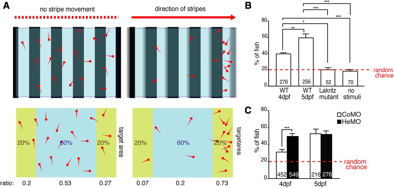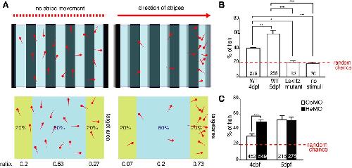 Figure 8. Hermes morphants exhibit stronger optomotor response. A, Model of the OMR test chamber. An LCD screen underneath the transparent chamber provides the moving stimulus stripe pattern. Fish shown a nonmoving stripe pattern are randomly distributed in the chamber, whereas fish shown a directionally moving stripe pattern swim preferentially to the end zone in the direction of the motion. B, WT embryos start responding at 4 dpf, and >60% respond at 5 dpf, with Lakritz mutants and embryos showing a static pattern showing no response. Error bars represent SEM. *p < 0.05; **p < 0.01; ***p < 0.001, ANOVA, Bonferroni posttest. C, HeMO-injected embryos perform significantly better than CoMO-injected embryos at 4 dpf, but this difference is absent at 5 dpf. ***p < 0.001, unpaired t test. The numbers of embryos analyzed are indicated on the bars. |