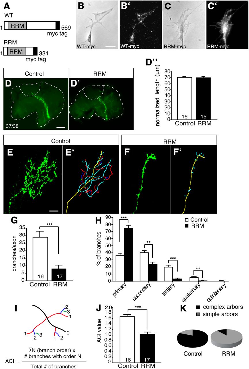 Figure 2. Hermes RRM-domain inhibits retinal axon branching in the tectum. A, WT myc-Hermes or myc-RRM mRNA was injected into both blastomeres of two-cell stage Xenopus embryos. B–C′, In retinal growth cones (cultured from mRNA-injected embryos at Stage 37/38 for 24 h), the mutant and WT myc-tagged Hermes proteins localize differently: WT myc-Hermes (B, B′) is punctate, whereas myc-RRM (C–C′) is distributed smoothly within the cytosol. D–D″, Lateral views of Stage 37/38 whole-mount brains showing the GFP-labeled optic pathway of control- (D) and RRM-injected embryos (D′) showing no significant difference in the trajectory or the length of axon in the optic tract (D″). E–F′, Single retinal axon terminal arbors in the tectum labeled with GFP at Stage 43 in control- (E) and RRM-injected embryos (F). The corresponding outlines of each terminal arbor are shown in E′ and F′, where branches of a different order are color coded: yellow, axon shaft; cyan, primary; red, secondary; blue, tertiary. G, H, RRM-expressing terminals show a significant decrease in total branch number (G) and branches of all branch orders (H). I, J, Comparing arbor complexity using the ACI (I) revealed a significant decrease in arbor complexity and a significant increase in the number of simple arbors (J) in RRM-expressing embryos compared to control. Error bars represent SEM. **p < 0.01; ***p < 0.0001; Mann–Whitney test. The numbers of axons analyzed are indicated on the bars. Scale bars: (in B) B–C′, 5 μm; (in D) D, D′, 50 μm; (in E) E–F′, 20 μm. |