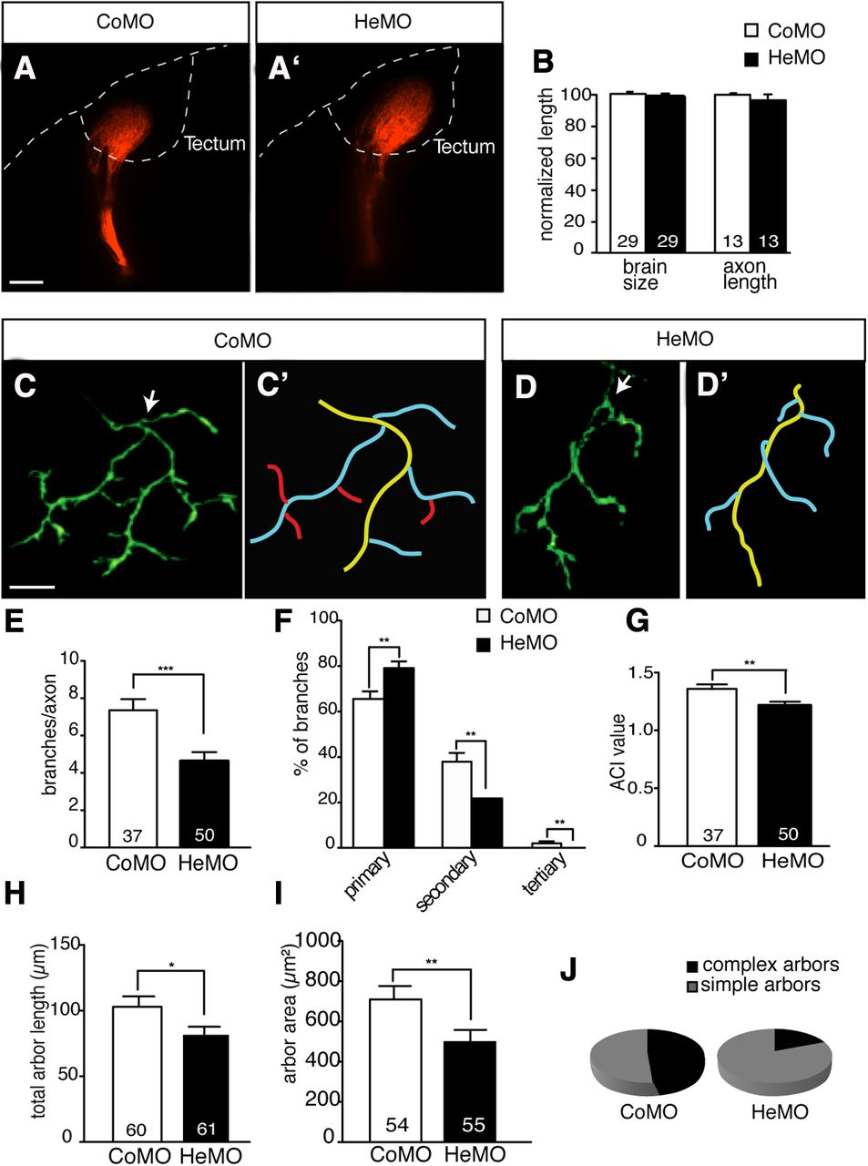 Figure 5. Hermes knockdown inhibits axonal branching in zebrafish. A–B, Embryos were injected with either CoMO or HeMO and fixed at 5 dpf followed by anterograde DiI labeling of RGC axons. Control- (A) and HeMO-injected embryos (A′) at 5 dpf show no difference in long-range axon guidance, brain size, or axon length (B). C–D′, Control- (C) or HeMO-injected embryos (D) were injected with eGFP to label single axons and are shown in whole-mount views of the tectum at 4 dpf, with corresponding tracings of arbor outlines in C′ and D′. E–J, HeMO-injected embryos show a significant reduction in total number of branches per axon (E), percentage of branches at all branch orders (F), ACI index (G), total arbor length (H), arbor area (I) and percentage of complex arbors (J). Simple arbors, ACI < 1.4; complex arbors, ACI ≥ 1.4. Error bars represent SEM. *p < 0.05; **p < 0.01; ***p < 0.001; Mann–Whitney test. The numbers of embryos (B) and axons (E–J) analyzed are indicated on the bars. Scale bars: (in A) A, A′, 50 μm; (in C) C–D′, 20 μm. |