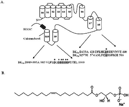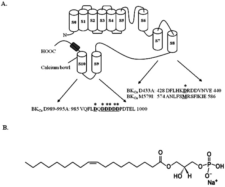 Fig. 1. Schematic transmembrane diagram of the BKCa channel in the plasma membrane and the LPA chemical structure. (A) There are 7 transmembrane domains along with the RCK1 and RCK2 domains. The voltage sensor and pore of the BKCa channel resembles the responding regions of other voltage-dependent K+ channels (Yuan et al., 2010). Amino acid residues underlined and marked (*) indicate mutation sites in this study. (B) The chemical structure of lysophosphatidic acid (LPA, C18:1).