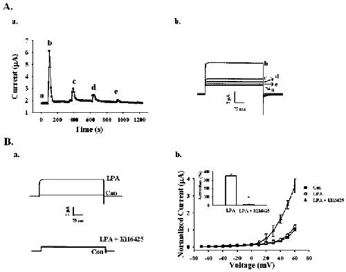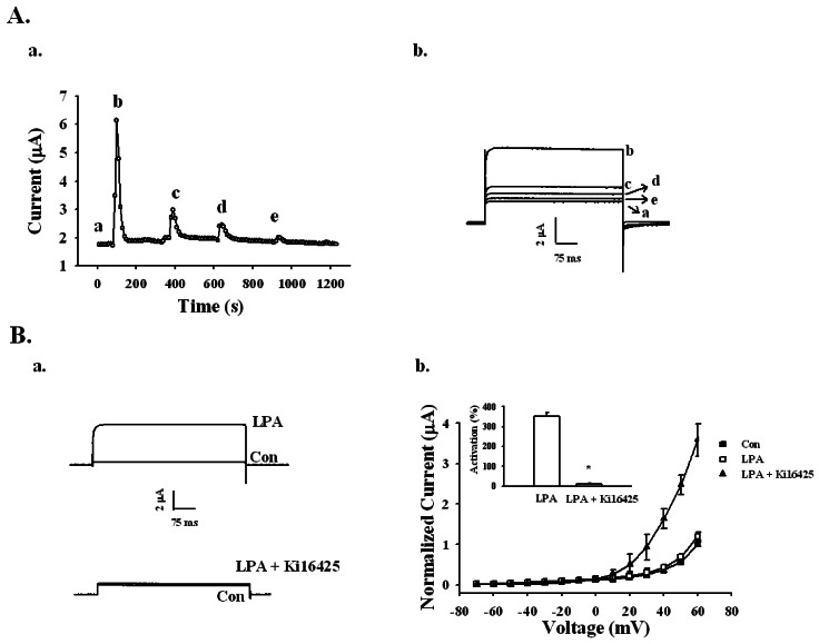 Fig. 3. Effects of repeated treatments of LPA and LPA1/3 receptor antagonist Ki16425 on LPA-mediated BKCa channel activation. (A-a) Repeated application of 100 nM LPA desensitized the BKCa channel activation with indicated time interval in representative oocyte (left panel). (A-b) The representative BKCa channel current traces by repeated LPA treatments were obtained from timecurrent relationship of a (right panel). Outward currents are caused by stepping from -80 mV to +40 mV for 400 ms. Data represent the mean±S.E.M. (n=5). (B-a) Representative traces are from the LPA channel activation in the absence (upper trace) or presence of 10 µM Ki16425 for 10 min (lower trace). (B-b) Summary histogram of the LPA effects on BKCa channel activation (right panel). Data represent the mean±S.E.M. (n=10~12; *p<0.01).