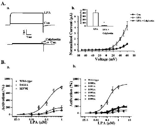 Fig. 5. Effects of PKC inhibitor and mutations in RCK1 and the Ca2+ bowl on LPA-mediated BKCa channel activation. (A-a) Effects of PKC inhibitor on LPA-mediated BKCa channel activation. A representative trace shows the activation of LPA-mediated (100 nM) currents in Xenopus oocytes expressing the BKCa channel in the absence or presence of 1.5 µM calphostin for 2 h. (A-b) Summary histograms of LPA-mediated BKCa channel activation in controls or with 1.5 µM calphostin (right lower panel). Data represent the mean±S.E.M. (n=10~12; *p<0.01). (B) Effect of mutations on the RCK1 and Ca2+ bowl domains in LPA-mediated BKCa channel activation. (B-a) The oocytes expressing wild-type or mutant BKCa channels in the RCK domain such as D433A or M579I were treated with LPA by a bathing application for 60 s. Mutations in the RCK domain attenuated the LPA concentration-responses (left panel). (B-b) The oocytes expressing wild-type or mutant BKCa channels in the Ca2+ bowl were treated with LPA by a bathing application for 60 s. Mutations in the Ca2+ bowl also attenuated LPA concentration-responses (right panel). Data represent the mean±S.E.M. (n=6).