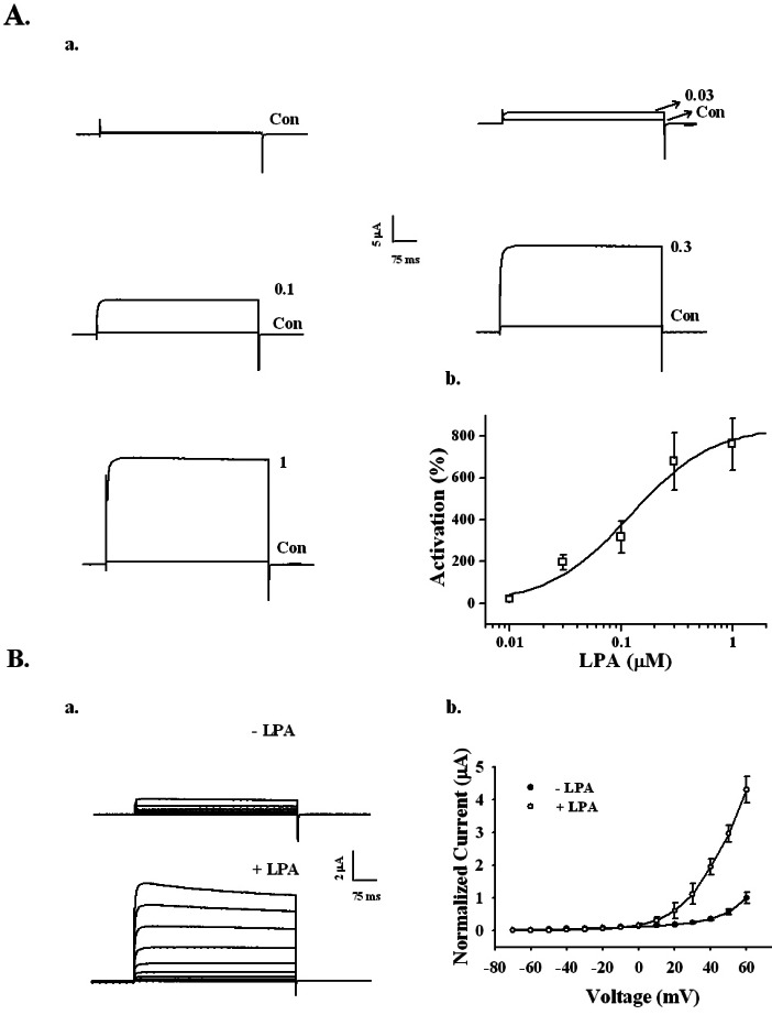 Fig. 2. Concentration- and voltage-dependent activation of the BKCa channel by LPA in Xenopus oocytes expressing rat brain BKCa channels. (A) The BKCa channel activation by LPA is concentration-dependent. (a) Representative traces of BKCa channel current enhancements using different concentrations of LPA (up to 1 µM). (b) The summary histogram shows the effects of various concentrations of LPA on the BKCa channels. (B) A representative control and LPA-mediated current in an I~V relationship. (a) Currents were recorded at a test potential from -70 to +60 mV, applied from a holding potential of -80 mV. (b) Current-voltage (I-V) relationship of the BKCa channel in the absence (●) or presence (○) of 100 nM LPA. Voltage pulses with 400-ms duration were applied in 10 mV increments at 3-s intervals from a holding potential of -80 mV. The current peaks, normalized to the peak current evoked by the voltage step to +60 mV in the absence of LPA, were used in the I-V plot. Data represent the mean±S.E.M. (n=4).
