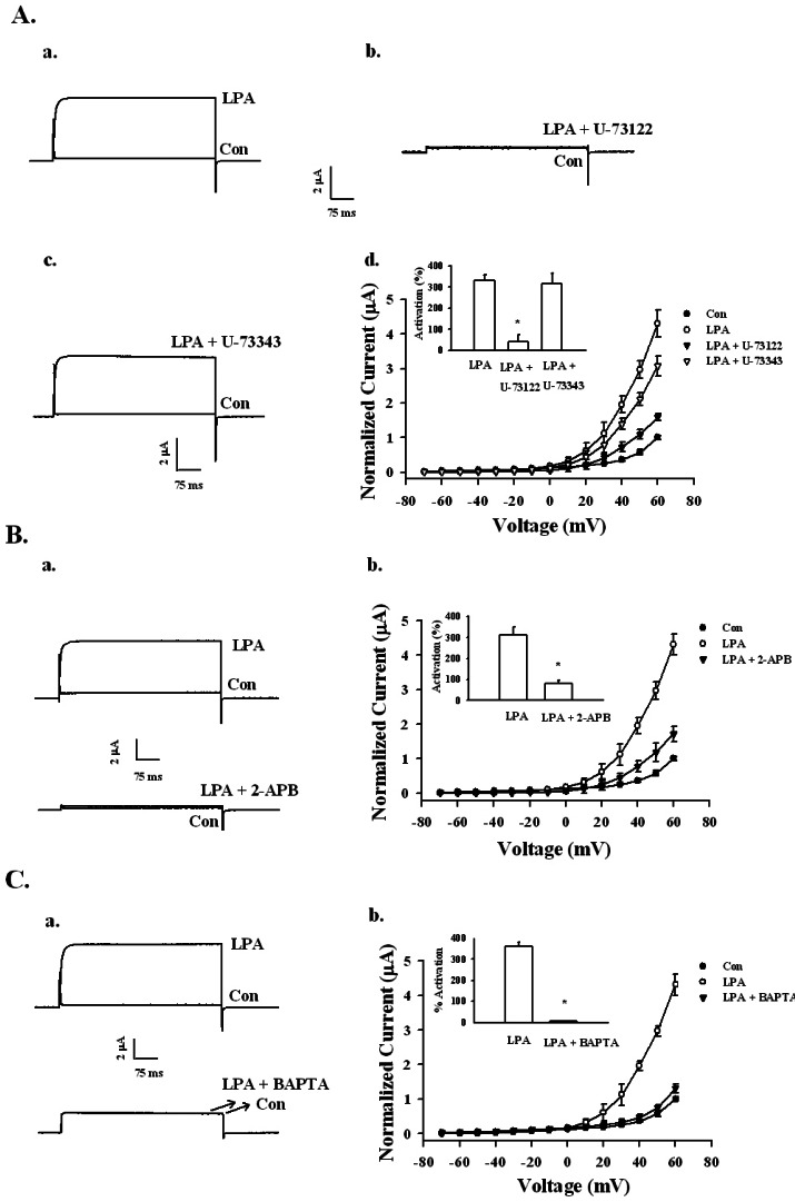 Fig. 4. Signaling pathway of LPA-mediated BKCa channel activation. (A) Effects of the PLC inhibitor on LPA-mediated BKCa channel activation. (a~c) A representative trace shows the activation of LPA-(100 nM) mediated currents in Xenopus oocytes expressing the BKCa channel in the absence or presence of inactive U73343 (1 µM) or active PLC inhibitor U73122 (1 µM). (d) Summary histograms of LPA-mediated activation on control, U-73122, or U-73343-treated groups (right lower panel). Data represent the mean±S.E.M. (n=10~11; *p<0.01). (B) Effect of IP3 receptor antagonist 2-APB on LPA-mediated (100 nM) BKCa channel activation. (a) Representative trace shows the activation of LPA-mediated (100 nM) currents in Xenopus oocytes expressing the BKCa channel in the absence or presence of 100 µM 2-APB for 20 min. (b) Summary histograms of LPA-mediated activation on control or 100 µM 2-APB (right lower panel). Data represent the mean±S.E.M. (n=12~14; *p<0.05). (C) Effect of intracellular Ca2+ chelator, BAPTA-AM, on LPA-mediated (100 nM) BKCa channel activation. (a) A representative trace shows the activation of LPA-mediated (100 nM) currents in Xenopus oocytes expressing the BKCa channel in the absence or presence of BAPTA-AM for 3 h. (b) Summary histograms of LPA-mediated activation on control or 100 µM BAPTA-AM (right lower panel). Data represent the mean±S.E.M. (n=10~12; *p<0.01).