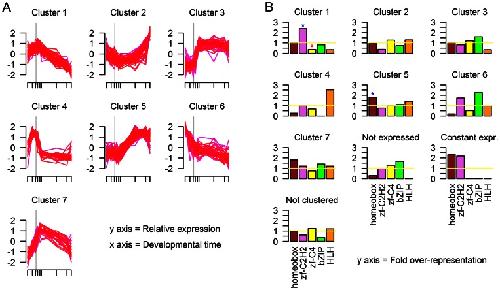 Figure 3. Clustering of transcription factor expression patterns in C. elegans.(a) The expression patterns of members of each of the seven clusters determined by Mfuzz. The gray vertical line indicates the onset of gastrulation. (b) The relative representation of different TF families in each cluster. Blue stars signify statistically significant over-representation of a TF family in a cluster; red stars signify statistically significant under-representation of a TF family in a cluster.