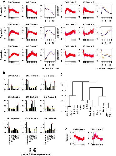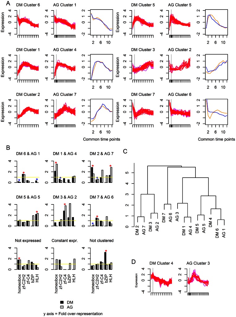 Figure 5. Comparison of TF expression clusters for Drosophila melanogaster and Anopheles gambiae.(a) The expression profiles of the cluster pairs. The gray vertical line indicates the onset of gastrulation. The plot in the third column shows the values of the centers of the clusters at each of the common time points. Orange is Drosophila melanogaster and blue is Anopheles gambiae. (b) Dendrogram showing hierarchical clustering of the clusters. (c) TF family representation in each cluster. The dark gray represents Drosophila melanogaster and the light gray Anopheles gambiae. Blue stars signify statistically significant over-representation of a TF family in a cluster pair; red stars signify statistically significant under-representation of a TF family in a cluster pair. (d) Clusters that were not paired.