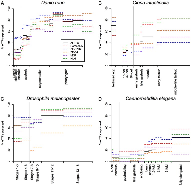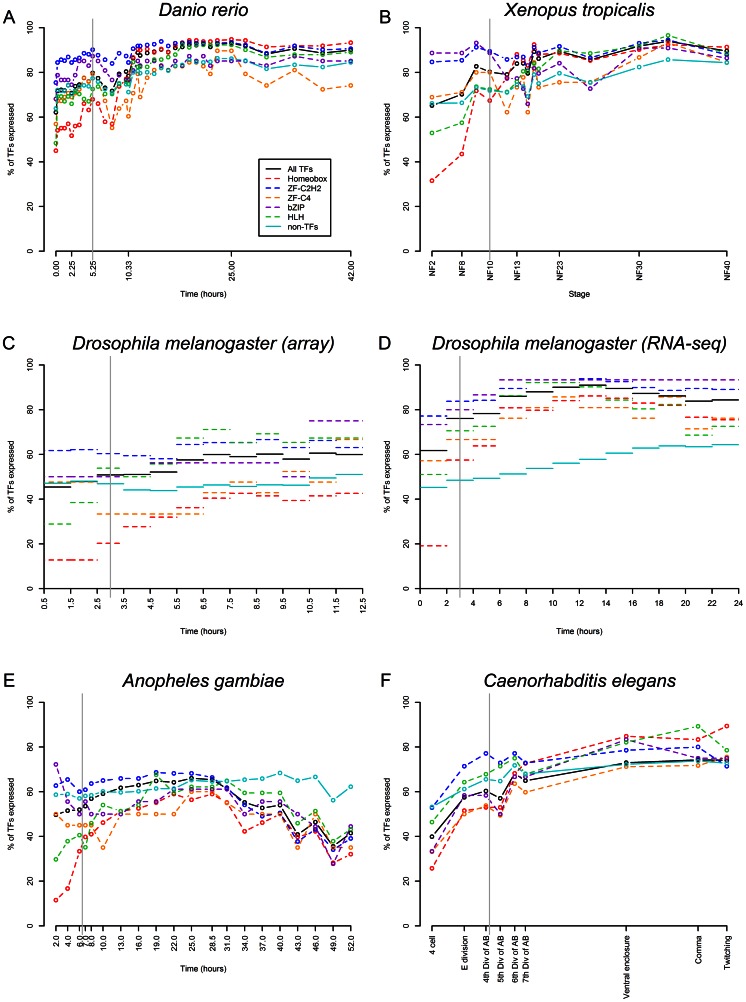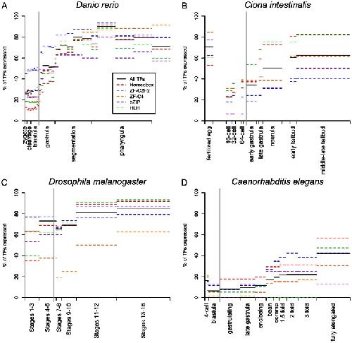 Figure 1. TF and TF family expression through embryogenesis based on in situ hybridization data.The gray vertical line in each plot indicates the onset of gastrulation. Table S1 shows the numbers of TFs and members of TF families included in each dataset used for this figure.