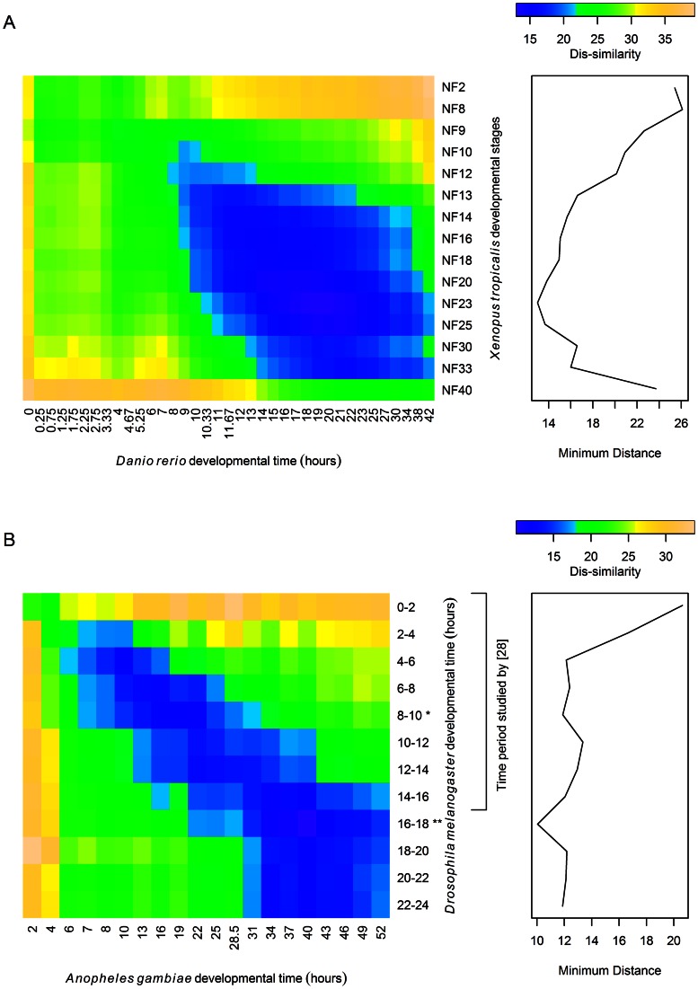 Figure 6. Similarity of TF transcriptomes between species.Heatmaps showing the similarity of the TF transcriptome at all time points for (a) Xenopus tropicalis and Danio rerio and (b) Drosophila melanogaster and Anopheles gambiae. Darker blue/violet shading indicates that the TF trancriptomes for the two species at the given times during development are more similar. The profiles on the right shows the minimum distance between (a) each time piont of Xenopus tropicalis and any time point in Danio rerio and (b) each time point of Drosophila melanogaster and any time point in Anopheles gambiae. In (b), the bracketed time periods for Drosopila are those included in the study by Kalinka et al. (2010) that showed that the time period between 8–10 hours is when the transcriptomes of different Drosophila species are most similar. That time period (indicated by a *) is a local maximum for TF transcriptome similarity between the two insects considered in this study; the 16–18 hour time period for Drosophila melanogaster (indicated by a **) is the time period with the greatest TF transcriptome similarity to Anopheles gambiae.
