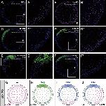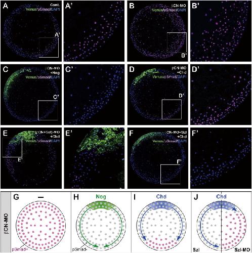 Figure S2. Distinct Long-Range Effects of Chordin and Noggin on pSmad1 Accumulation, Related to Figure 1 (A-F) Immunostaining of phospho-Smad 1 (pSmad1) in the midgastrula embryo. Cryostat sections across the dorsal-to-ventral marginal zone were made parallel to the plane of the blastopore. (A') through (F') show high-magnification images of the insets. (A) and (A') show the control embryo. Strong pSmad accumulation was preferentially seen in the ventral-most region. (B) and (B') show the β-CN-MO embryo. Strong pSmad accumulation was observed throughout the embryo. (C) and (C') show β-CN-MO embryo with single-blastomere injection of noggin (25 pg: venus expression as tracer) at the 8-cell stage. No substantial pSmad accumulation was seen on either the injection or noninjection side, indicating that the effect of noggin spread to the opposite side. (D) and (D') show β-CN-MO embryo with single-blastomere injection of chordin (25 pg: venus expression as tracer) at the 8-cell stage. Substantial pSmad accumulation was observed on the side opposite to the injection region, indicating that the influence of chordin was distance-sensitive. (E) and (E') show β-CN-MO + sizzled-MO embryo with single-blastomere injection of chordin. The area of pSmad accumulation expanded toward the chordin-injection domain. (F) and (F') show β-CN-MO embryo with single-blastomere injection of chordin. In this case, sizzled mRNA (400 pg) was coinjected with β-CN-MO at the 2-cell stage. No substantial pSmad accumulation was seen even on the noninjection side, reminiscent of noggin injection in (C). (G-J) Schematic summary of the differential effects of noggin and chordin in the reconstitution assay. |
