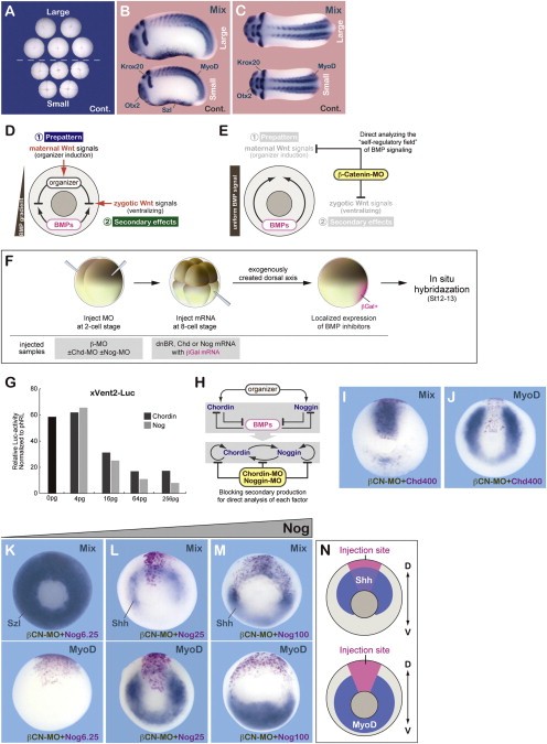 Figure S1. Distance-Dependent Difference of chordin and noggin Effects, Related to Figure 1 (A-C) Scaling of the embryonic pattern to the body size. (A) Examples of larger (top) and smaller (bottom) embryos at the 4-cell stage. (B and C) Whole-mount in situ hybridization of larger (top) and smaller (bottom) embryos with mixed probes for otx2 (forebrain), krox20 (hindbrain and part of cephalic neural crest), myoD (somite), and sizzled (ventral). (D and E) In (D), influences of Wnt-related maternal prepatterning (1) and secondary zygotic events (2) are shown. (E) β-catenin-MO injection suppresses both of them. (F) Schematic of reconstitution assays using mRNA injected-mediated axis rescue in the MO-injected embryos. (G) BRE (pXvent-2)-luciferase reporter assays for examining suppression of endogenous BMP signals by injection of chordin or noggin mRNA into the triple knockdown embryo. The titration data showed that chordin and noggin exert similar levels of anti-BMP functions. (H) Suppression of mutual influences and autoactivation of Chordin and Noggin by MOs. (I and J) Single-blastomere injection of chordin at a high dose (400 pg) in the β-CN-MO embryo. Even at this high dose, chordin induced a discrete dorsal axis (92.9%, n = 14), instead of causing global hyperdorsalization as noggin did (see the following panels). (K-N) Single-blastomere injection of noggin (8-cell stage) at different doses in the β-CN-MO embryo (lacZ as a tracer). Whole-mount in situ hybridization with mix probes of sizzled and shh (top) or with the myoD probe (bottom). Even at a low dose (25 pg), noggin injection caused almost radial expansion of myoD (100%, n = 10). At a 100-pg dose, shh expression expanded diffusely to the ventral side (100%, n = 15). (N) Schematic summary of results of (K) through (M). Unlike chordin injection, noggin injection promotes an embryo-wide global dorsalization, instead of inducing a discrete dorsal axis. |