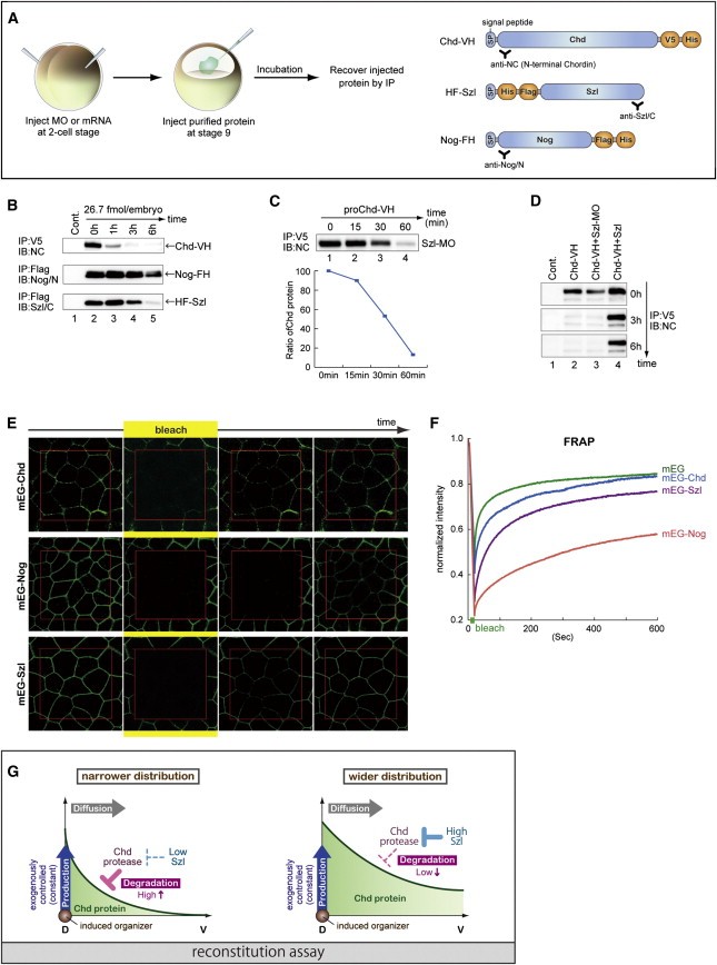 Figure 2. Rapid Proteolysis Limits the Working Range of Fast-Diffusing Chordin (A) Schematic of blastocoel injection assay. Proteins were immunoprecipitated with a C- or N-terminal antibody and detected with an antibody against the opposite end to selectively measure full-length proteins. (B and C) Degradation kinetics of recombinant Chordin (B and C), Noggin (B), and Sizzled (B) in the embryo. (D) Effects of depletion (lane 3) and overexpression (lane 4) of Sizzled on Chordin stability. (E and F) In (E), FRAP assays of mEGFP-tagged Chordin (top), Noggin (middle), and Sizzled (bottom) shown by snapshots. From left to right columns; before bleaching, at the end of bleaching, 50 s after bleaching, and 230 s after bleaching. (F) Recovery kinetics of mEGFP-tagged proteins. mEG, control (secretable mEGFP) for free-diffusing protein (green). mEG-Chd, tagged Chordin (blue); mEG-Nog, tagged Noggin (pink); and mEG-Szl, tagged Sizzled (purple). Injection was done with 600 pg mRNA. (G) Schematic of diffusion properties of Chordin. See also Figures S3 and S4 and Movies S1, S2, S3, S4, and S5. |