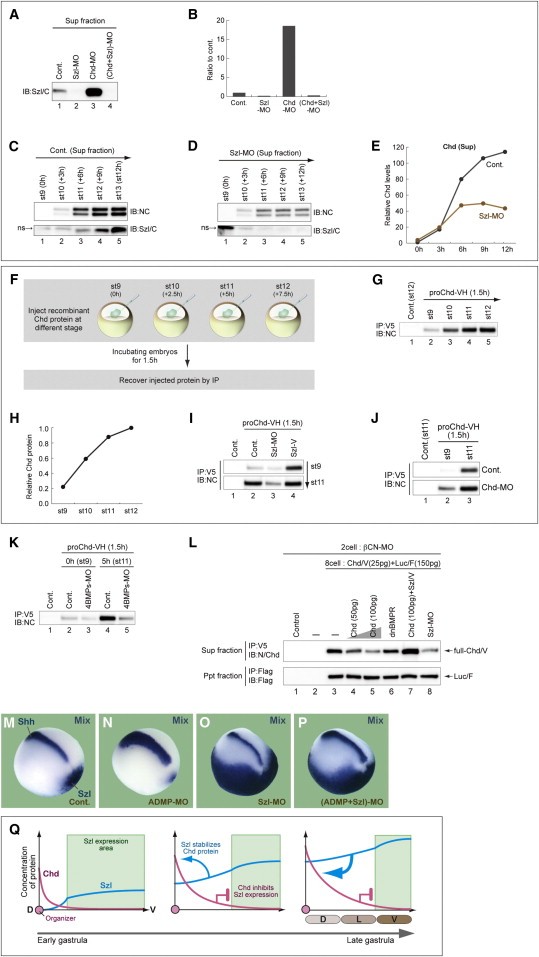 Figure 4. Dynamically Controlled Protein Accumulation in the Chordin-Sizzled Feedback System (A-E) Endogenous proteins were recovered from extracellular fluid by dissociating embryos in a small volume of cold CMFM (Ca2+/Mg2+-free medium) with 7.5 mM EDTA at 4ºC (5 μl per embryo; 25 μl per lane for loading). In (A) and (B), increase of endogenous Sizzled protein by Chordin depletion (lane 3) is shown by western blot. Sizzled protein in the same number of stage 12 embryos was loaded in each lane. (B) shows protein quantification in (A). The level of Sizzled in the control embryo was defined as 1. (C) through (E) show accumulation of endogenous Chordin and Sizzled proteins during gastrulation. Secreted fractions in the control (C) and sizzled-MO-injected (D) embryos were analyzed. (E) Quantification of protein levels. (F-H) Stage-dependent Chordin stability was analyzed in the blastocoel injection assay. In (G), the intact form of recombinant Chordin protein was quantified 1.5 hr after blastocoel injection (at stage 9, 10, 11, or 12). (H) shows the line graph presentation of results in (G). (I) Effects of Sizzled depletion and overexpression on increased stability of recombinant Chordin at stage 11 in the blastocoel injection assay. (J) Injection of chordin-MO (bottom) increased the stability of recombinant Chordin in the blastocoel injection assay. (K) Depletion of all four BMPs (lane 5) promoted Chordin degradation in the stage 11 embryo. (L) The amount of intact V5-tagged Chordin protein (top) was decreased when nontagged chordin (100 pg; lane 5) was coinjected with V5-tagged chordin (25 pg) into a vegetal blastomere of eight-cell embryos (compare with lane 3). β-CN-MO, Sizzled-MO, and Szl mRNA were injected at the two-cell stage. luc/F (bottom, injection control) and dnBMPR mRNA were injected at the eight-cell stage. (M-P) Effects of MOs for admp and sizzled on DV markers. ADMP depletion moderately expanded the expression of the dorsal axial marker and reduced that of the ventral marker; 100%, n = 20, in (N). Sizzled depletion suppressed the dorsal axial marker and dramatically expanded the ventral marker; 100%, n = 14, in (O). Combined depletion of ADMP and Sizzled caused a phenotype similar to that by Sizzled depletion; in (P) 100%, n = 16, for dramatic sizzled expansion with no substantial shh expansion. (Q) Schematic of the long-range feedback and accumulation model. Distribution of Chordin and Sizzled along the DV axis is shown in red and blue, respectively. ns, nonspecific band. |