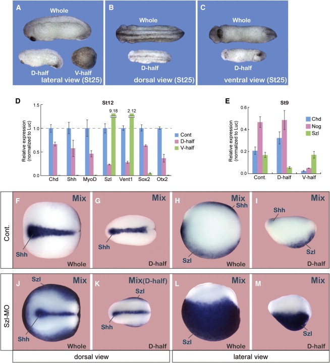 Figure 5. Essential Role of the Chordin-Sizzled System in DV Pattern Scaling after Bisection (A-C) External phenotypes at the tailbud stage in bisection experiments (bisection was done at stage 8). Lateral, dorsal, and ventral views are shown in (A), (B), and (C), respectively. (D) Transcript levels of regional markers in the same number of control (blue), dorsal-half (red), and ventral-half (green) embryos (stage 12) shown by qPCR (three experiments). Bars represent SD. (E) Transcript levels of chordin (blue), noggin (red), and sizzled (green) in the same number of control, dorsal-half, and ventral-half embryos at stage 9 (three experiments). Bars represent SD. (F-M) Effect of Sizzled depletion on DV marker patterns in bisection conditions. (F) through (I) show uninjected controls. (J) through (M) show sizzled-MO-injected embryos. (F), (H), (J), and (L) show whole embryos. (G), (I), (K), and (M) show bisected dorsal halves. (F), (G), (J), and (K) show dorsal views. (H), (I), (L), and (M) show lateral views. (I) Balanced shh and sizzled expression in 100%, n = 11. (L) shows dramatic sizzled expansion in 100%, n = 20. (M) shows disproportionate reduction in sizzled expression in 100%, n = 12. See also Figure S5. |