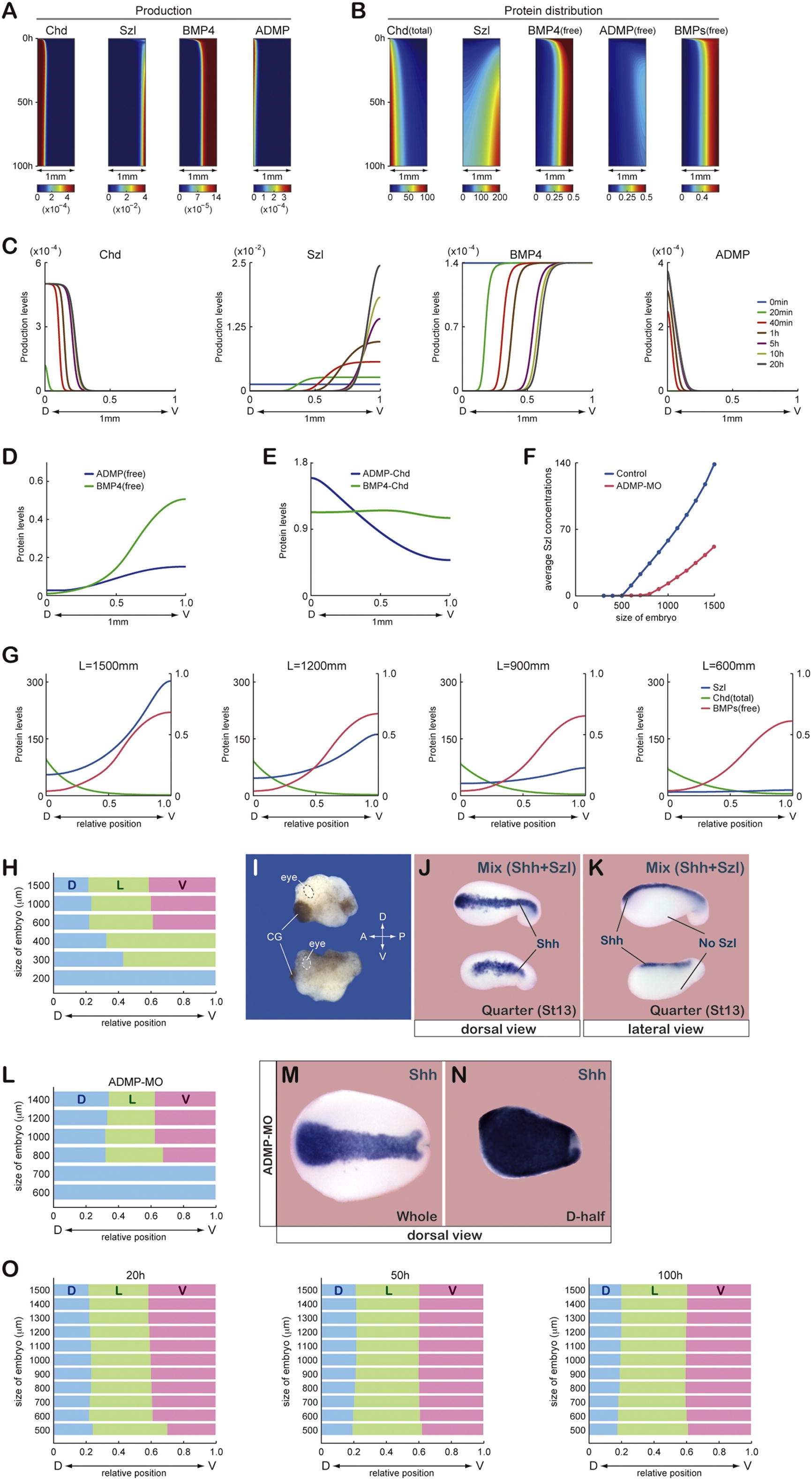 Figure S6. Computer Simulation of DV Patterning Based on the "Long-Range Accumulation and Feedback" Model, Related to Figure 6 (A) Space-time plots of regional production of Chordin, ADMP, Sizzled, and BMP4. (B) Space-time plots of protein distribution of Chordin (total), Sizzled, free BMP4, free ADMP, and free BMPs (free-ADMP + free-BMP4). (C�L) Simulation results at 20 hr. (C) Temporal profiles of regional production of Chordin, ADMP, Sizzled and BMP4. (D) Simulated protein distribution of free BMP4 and free ADMP. (E) Simulated protein distribution of BMP4-Chordin and ADMP-Chordin complexes. (F) Simulation results showing embryo-size-dependent changes of average Sizzled concentrations in the wild-type and ADMP-depleted embryos. (G) Embryo-size-dependent distribution of total Chordin, free BMPs, and Sizzled proteins along the DV axis. The y-axis stands for protein levels for Sizzled, total Chordin (left scale), and free BMPs (right scale). (H) Collapse of scaling upon a further body-size reduction in the simulation. The quarter-sized embryo (around the dorsal end) became hyperdorsalized in (I) (no scaling) and expressed little ventral marker in (J) and (K) (no sizzled expression in 100%, n = 16). In (L), scaling occurred, but within a narrower range, in the simulated ADMP-depleted embryo. (M) ADMP-depletion caused a moderate dorsalization in the embryo. (N) Bisection caused a strong hyperdorsalization (see a catastrophic expansion of shh expression) in the ADMP-depleted embryo, unlike the wild-type (Figure 5G). (O) Simulated effects of embryo-size reduction on relative DV patterning in the wild-type embryo at 20, 50, and 100 hr. |