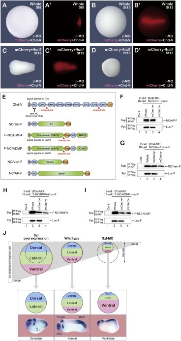 Figure S7. Size-Sensitive Control of Proteolysis and Protein Distribution in DV Patterning, Related to Figure 7 (A-D') Bisection experiments using β-catenin MO embryos that received a single-blastomere injection at the 16-cell stage. (A), (B), (C), and (D) show a bright field view. (A'), (B'), (C'), and (D') show mCherry fluorescence (tracer for injected cells). Whole embryos are shown at stage 8 in (A) and (A') and stage 13 in (B) and (B'). (C), (D), (C'), and (D') show bisected injected halves in (C) and (C') and noninjected halves in (D) and (D') at stage 13 (bisected at stage 8). With the guide of mCherry fluorescence, the embryo could be reproducibly bisectioned into injected and noninjected halves. (E) Construction of tagged proteins in these assays. (F) Distribution of the control protein (secretable alkaline phosphatase produced by injection of 12.5 pg mRNA; NC-SEAP; NC is an epitope tag) in bisected halves (β-catenin-MO injected) at stage 13 equivalent (bisection was done at stage 8). Unlike Chordin (Figure 7B), NC-AP protein accumulation in the injected half (lane 3) was comparable to that in the whole embryo (lane 2). (G) Distribution of NC-Venus (control free-diffusing protein; produced by injection of 12.5 pg mRNA) in the injected and noninjected halves at the early gastrula stage (soon after bisection; compare with Figure 7E). A substantial level of NC-Venus was detected also on the noninjected side (lane 4). (H and I) Long-range diffusion of tagged (H) BMP4 and (I) ADMP proteins (produced by injection of 12.5 pg mRNA) to the other side of the embryo. (J) Schematic of the idea that the level of Sizzled conveys the size information of the embryo. On the basis of the "long-range accumulation and feedback model," it may be also considered that the DV patterning system interprets the embryonic size according to the Sizzled level: in this reverse-angle view, embryos with Sizzled overexpression and depletion are larger and smaller, respectively, in their imaginary sizes judged by the patterning system (brown circles; top), whereas the DV patterns in the real size embryos that we see (black circle; top) correspond to dorsalization and ventralization (bottom). |