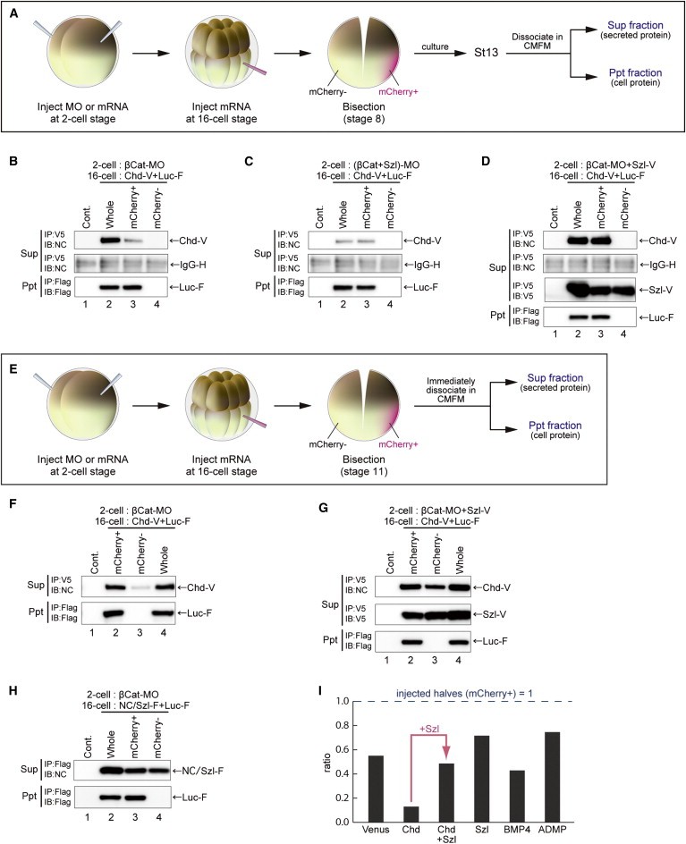 Figure 7. Size-Dependent Control of Chordin Stability. (A) Schematic of reconstitution experiments. The dorsal axis was rescued by a single-blastomere injection of chordin (V5-tagged; 12.5 pg) in the β-catenin-depleted embryo. As a tracer, mcherry (200 pg) was coinjcted for marking the injected site. (BâD) Effect of bisection on the levels of intact Chordin protein. Lanes 1 show uninjected whole embryos. Lanes 2 show whole embryos with mRNA injection. Lanes 3 show injected halves (mCherry+). Lanes 4 show uninjected halves (mCherryâ). IgG-H is the loading control for interexperimental comparison for (B)through (D). In (B), the amount of intact Chordin (top) was decreased in the dorsal halves as compared to that in the same number of the whole embryos. This contrasted the largely constant amounts of control luciferase (bottom; 150 pg luciferase mRNA injection). As shown in (C), when Sizzled was depleted in addition, the amounts of intact Chordin with (lane 3) or without (lane 2) bisection were comparable and low. In the Sizzled-overexpressed conditions in (D), the amounts of intact Chordin with (lane 3) or without (lane 2) bisection were comparable and high. (EâI) Analysis of long-range protein distribution at the early gastrula stage. (E) Schematic of comparison of protein contents in âinjectedâ (mCherry+) and âuninjectedâ (mCherryâ) halves of the stage 11 embryo. In (F), epitope-tagged Chordin was predominantly detected in the âinjectedâ halves (lane 2). In (G), when Sizzled was overexpressed, epitope-tagged Chordin was detected also in the âuninjectedâ halves. In (H), Sizzled (12.5 pg), expressed on one side, was detected on the other side. (I) shows ratios of protein levels detected in the âuninjectedâ halves (the level in the âinjectedâ halves is defined as 1). See also Figure S7. |