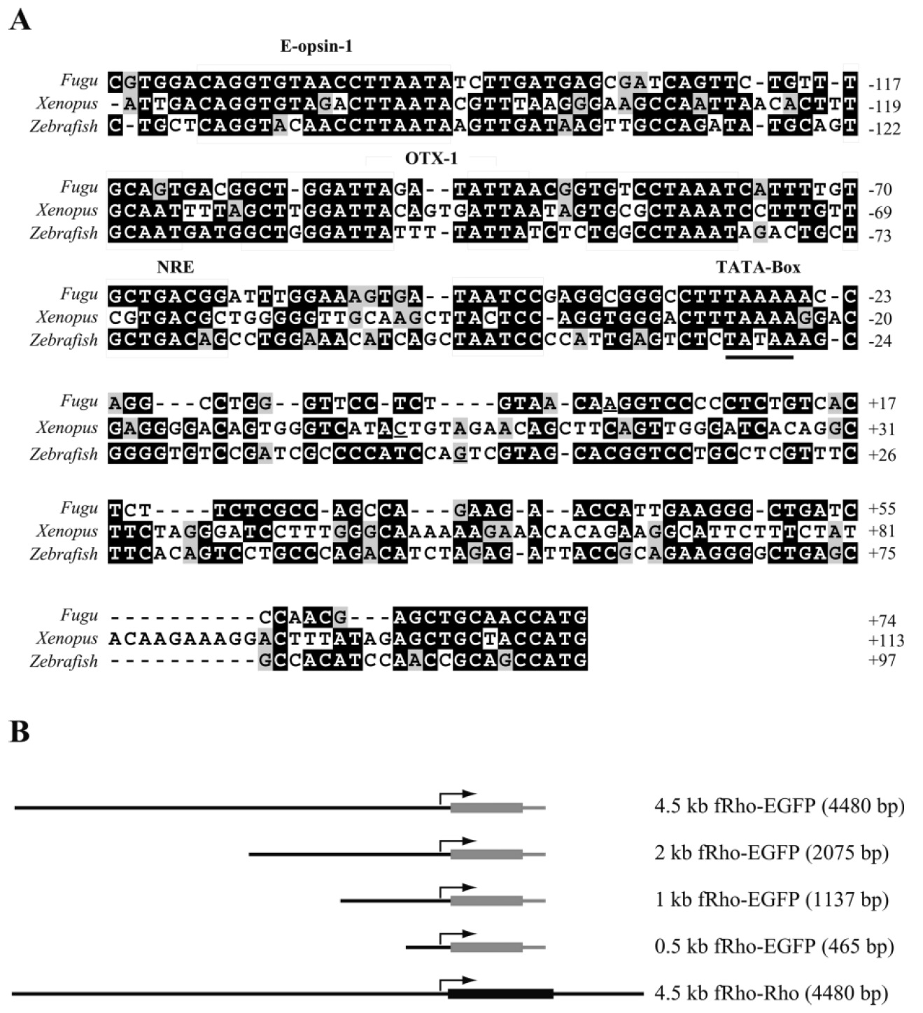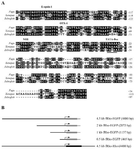 Fig. 2. Fugu rhodopsin proximal promoter contains conserved regulatory motifs. (A) Fugu, Xenopus and Zebrafish proximal rhodopsin promoters were aligned