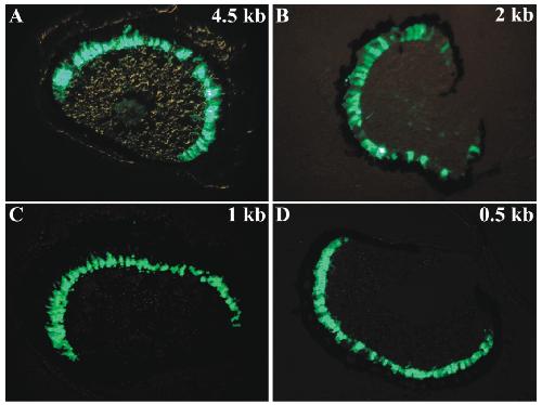 paraformaldehyde for cryo-sectioning. High-level and specific EGFP fluorescent signals were observed in eye sections of 4.5, 2, 1, and 0.5 kb promoterreporter