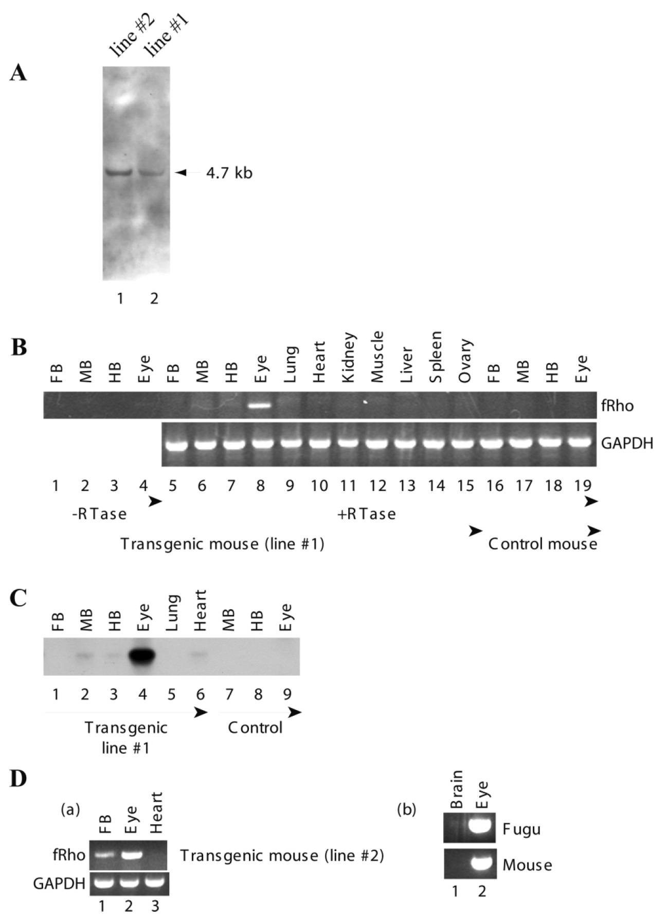 (D,a). RT-PCR of Line #2 mouse RNA from forebrain, eye and heart (up panel, lanes 1–3) tissues were performed by using Fugu rhodopsin specific primers. A