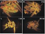 rhodopsin promoters were visualized in vivo using fluorescent microscopy (A-D). Arrowheads indicate fluorescent signals in the eyes. Some of the transgenic