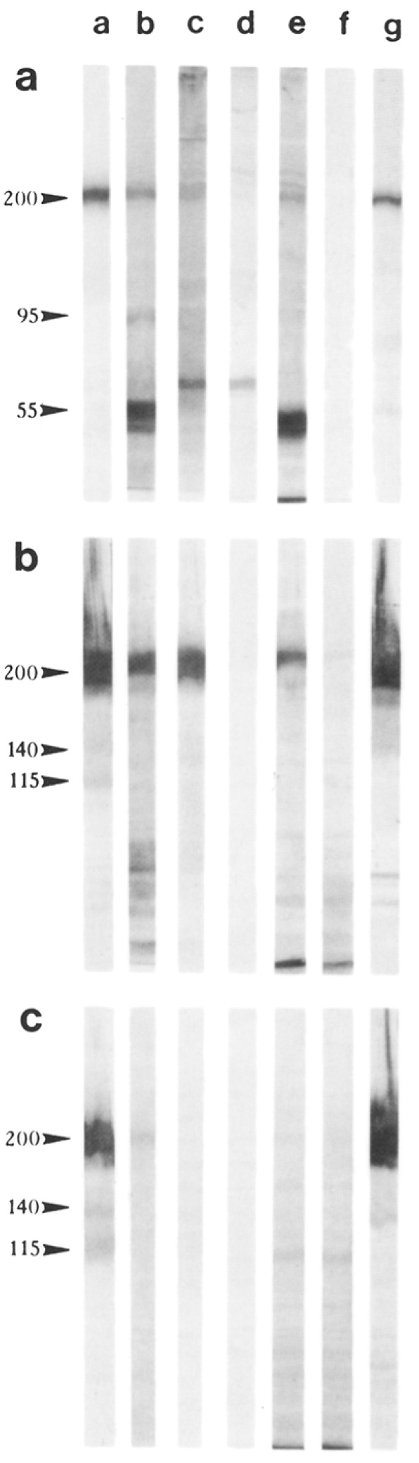 mAb 9-OE bound to the 205-kD N-CAM subset. In the N-CAM-depleted preparations (lanes a and c), mAb 9-OE continued to bind,