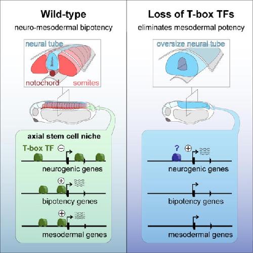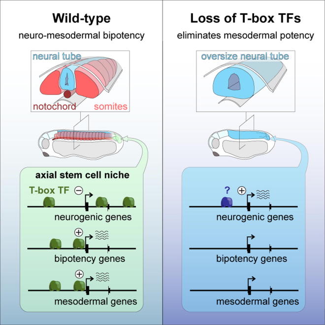 The design of effective cell replacement therapies requires detailed knowledge of how embryonic stem cells form primary tissues, such as mesoderm or neurectoderm that later become skeletal muscle or nervous system. Members of the T-box transcription factor family are key in the formation of these primary tissues, but their underlying molecular activities are poorly understood. Here, we define in vivo genome-wide regulatory inputs of the T-box proteins Brachyury, Eomesodermin, and VegT, which together maintain neuromesodermal stem cells and determine their bipotential fates in frog embryos. These T-box proteins are all recruited to the same genomic recognition sites, from where they activate genes involved in stem cell maintenance and mesoderm formation while repressing neurogenic genes. Consequently, their loss causes embryos to form an oversized neural tube with no mesodermal derivatives. This collaboration between T-box family members thus ensures the continuous formation of correctly proportioned neural and mesodermal tissues in vertebrate embryos during axial elongation.
