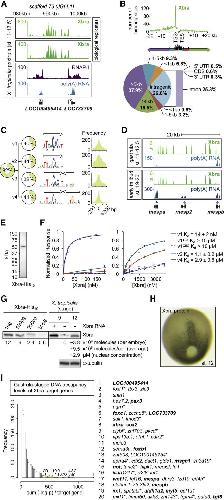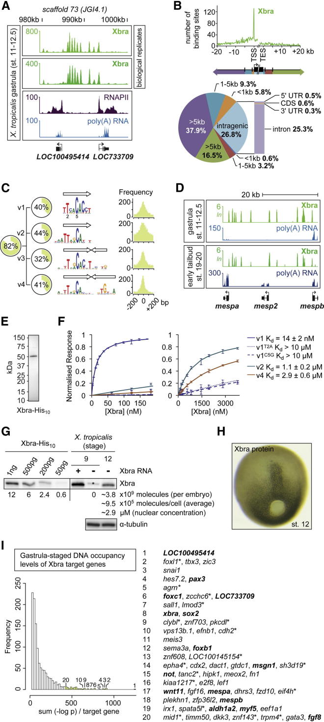 Figure 1. Xbra Is Stably Recruited to Mono- and Dimeric Motif Variants in the X. tropicalis Genome during Early Embryogenesis(A) Excerpt of normalized Xbra binding at gastrula stage. RNAPII and poly(A) RNA profile from Akkers et al. (2009).(B) Genomic distribution of Xbra binding sites (FDR ≤ 1%) relative to the start (TSS) and end (TES) of transcription of nearest target genes.(C) De novo motif discovery analysis of Xbra-bound regions with coverage, sequence logo, and positional distribution for each T-box motif variant (v1–v4). Arrow indicates monomeric binding site.(D) Comparison of Xbra binding at gastrula and early tail bud stage near mesp gene cluster with poly(A) RNA profile from Akkers et al. (2009) and this study.(E) Coomassie staining of 0.5 μg purified Xbra-His10 run on a SDS-polyacrylamide gel.(F) Surface plasmon resonance diagrams (normalized response versus Xbra concentration) including Kd values for the interaction between native Xbra protein and different DNA motifs (v1, v2, and v4). Superscript T2A and C5G refer to base changes introduced in v1.(G) Quantification of Xbra protein levels in midgastrula embryos (stage 12) by western blotting with standard curve of purified Xbra-His10 as indicated. Positive control, pregastrula embryo (stage 9) injected with RNA encoding untagged Xbra. Protein extracts equivalent to two embryos at stages 9 (negative control) and 12 were loaded. Asterisk marks nonspecific band seen at stage 9. The same band is present at the same intensity in the absence of Xbra at stage 12 (data not shown), and its intensity was therefore subtracted from the Xbra band for quantification. Further calculations (molecules/cell) and nuclear concentrations (μM) are based on an estimated 4,000 Xbra-positive cells at stage 12 ([H]; Cooke, 1979), a nuclear envelope (sphere) surface of ∼300 μm2 (Levy and Heald, 2010), and 90% of Xbra being nuclear. Loading control, α-tubulin.(H) Whole-mount immunohistochemistry of Xbra protein in a midgastrula embryo (stage 12).(I) Histogram of nearest gene-associated Xbra binding levels as detected by ChIP-seq. The asterisk indicates genes with nearest Xbra binding >10 kb from TSS. Genes in bold are mentioned elsewhere in this study.See also Figure S1 and Table S1. |