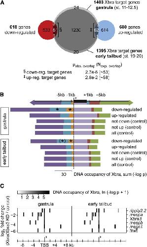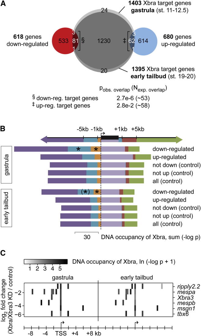 Figure 3. Strongly Activated Target Genes Show Preferential Xbra Binding to Promoter-Proximal and Intermediate Upstream Regions(A) Venn diagram of genes targeted by Xbra at gastrula and/or early tail bud stages (sum [−log pgastrula] or sum [−log ptailbud] ≥ 25) and genes misregulated at stage 32 (≥1.5-fold; FDR < 10%) following Xbra/Xbra3 KD. Fisher’s exact test indicates probability of observed overlap (pobs. overlap) and expected number of overlap (Nexp. overlap) based on random draws of gene sets from 16,760 genes (for which differential expression was calculated in Table S2).(B) Xbra binding at gastrula and early tail bud stage across down- or upregulated target genes (≥1.5-fold; FDR < 10%) compared with control sets of target genes. The asterisk indicates significantly (p < 0.05) enriched binding compared to controls according to a one-tailed Mann-Whitney U test (Extended Experimental Procedures). Brackets indicate loss of statistical significance (p ∼ 0.2) when zero DNA occupancies were excluded. See also Table S3.(C) Heat map representation of Xbra binding near strongly Xbra/Xbra3-dependent target genes at gastrula and early tail bud stages. |