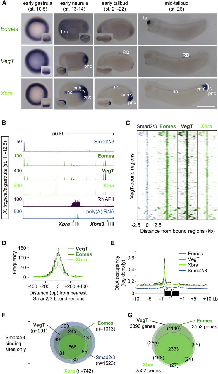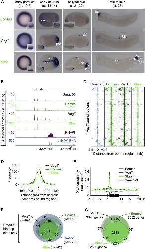 Figure 4. Eomes, VegT, and Xbra Occupy the Same Genomic Recognition Sites and TGF-β Responsive Regulatory Elements(A) Developmental series of WMISHs for Eomes, VegT, and Xbra. cnh, chordoneural hinge; hm, head (prechordal) mesoderm; no, notochord; pnc, posterior wall of neurenteric canal; RB: Rohon-Beard cells; te, telencephalon. The scale bar represents 0.5 mm.(B) Gastrula-staged snapshot of Eomes, VegT, Xbra, and Smad2/Smad3 (Yoon et al., 2011) binding near Xbra and Xbra3.(C) Heat maps represent DNA occupancies of Smad2/Smad3, Eomes, VegT, and Xbra relative to all VegT-bound regions during gastrulation.(D) Histograms based on pairwise calculations of shortest distances between T-box TF and Smad2/Smad3 binding positions (FDR ≤ 1%) during gastrulation.(E) Metagene model shows DNA occupancy level of Eomes, VegT, Xbra, and Smad2/Smad3 relative to the start and end of nearest target genes.(F) Venn diagrams for Smad2/Smad3 binding positions overlapping (distance ≤ 100 bp) with the binding position of Eomes, VegT, and/or Xbra (FDR ≤ 1%).(G) Venn diagrams for Eomes, VegT, and Xbra target genes. The stringency was relaxed up to p ≤ 0.1 unless DNA occupancy was found equivalent to p ≤ 10−25 when comparing binding between two T-box TFs. DNA occupancies (p ≤ 10−25 + 10−25 < p ≤ 0.1 = total) detected as follows: Eomes (2407 + 1145 = 3552); VegT (3628 + 268 = 3896); Xbra (1379 + 1173 = 2552). The extent of overlap between genes targeted by different T-box TFs might be greater than indicated in brackets, because peaks (p ≤ 0.1) sometimes failed to be detected.See also Figure S5 and Table S1. |