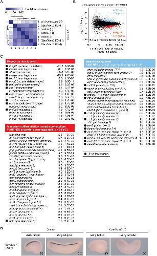 Figure S4. Transcriptome Analysis of Xbra/Xbra3-Depleted Early Tadpoles Confirms Cell Identity Shift from Mesoderm to Neurectoderm, Related to Figure 2(A) Hierarchically clustered heat map of transcriptional profiles (RNA-Seq) of control and Xbra/Xbra3 KD embryos at early tadpole stage (stage 32) in biological triplicates based on Euclidean distances. Wild-type embryos (stage 20) were used as an outlier. We note considerable biological variation among biological replicates (I and III versus II) causing clustering irrespective of KD condition.(B) Plot of averaged read count between the control and KD condition versus the log2 fold change between Xbra/Xbra3 KD and control embryos. Under the condition of 10% FDR, 724 genes were declared as upregulated (4.3%, blue dots), 844 genes as downregulated (5.0%, red dots) and 15,192 genes as not significantly differentially expressed (90.6%).(C) Statistical significance of gene mis-regulation (â¥1.5-fold, FDR < 10%) specific to mesoderm (downregulated; p < 7.8e-6) and neurectoderm (upregulated; p < 4.1e-3) was based on the Mann-Whitney U test using the PANTHER classification system (Mi et al., 2007). Early embryonic tissue-specific data sets were manually curated. Tables list mis-regulated genes (including fold changes and p-values adjusted with the Benjamini-Hochberg procedure) mainly associated with the biological process of mesoderm development (gene abbreviations are followed by the gene-associated mesodermal process in parentheses), muscle contraction (PANTHER GO term) and neural development (PANTHER GO term). A minus preceding the floating-point number of the fold change indicates a downregulation. Genes marked with a dot were associated with Xbra binding.(D) WMISH for caveolin-1 (cav1) at early tailbud and early tadpole stage illustrates the loss of notochord development upon Xbra/Xbra3 KD. Statistics in bottom right corner indicates the number of embryos observed with the depicted WMISH pattern versus the number of embryos analyzed in total. |