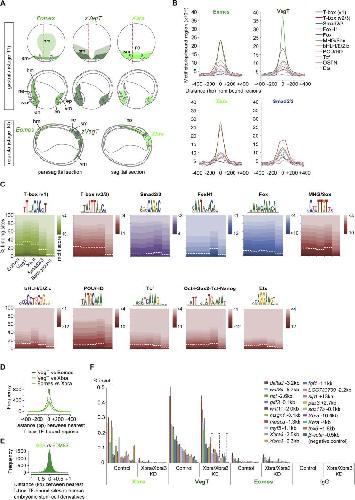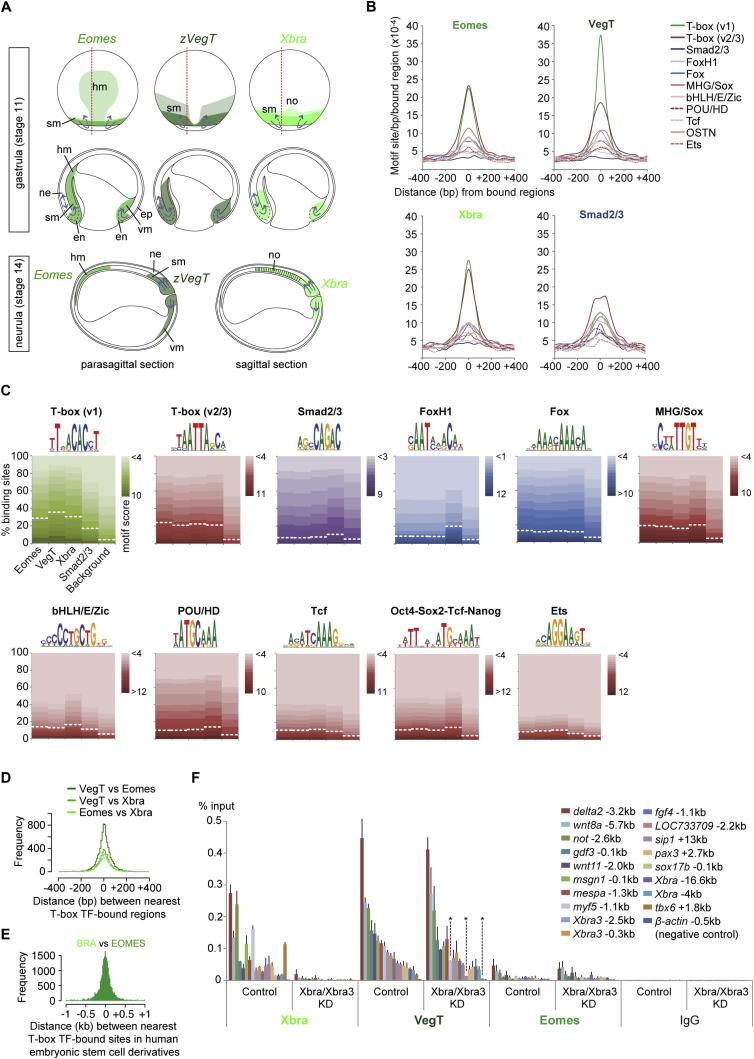Figure S5. Expression Patterns and Binding Characteristics of Eomes, VegT, and Xbra in Xenopus Embryos during Gastrulation, Related to Figure 4(A) Expression pattern scheme of Eomes, VegT and Xbra at gastrula (dorsal view and parasagittal section as indicated with ventral side to the right) and early neurula (sagittal and parasagittal section with posterior end to the right) based on our own WMISH and WMIHC (not shown) and published expression data (Fukuda et al., 2010; Horb and Thomsen, 1997; Ryan et al., 1996; Smith et al., 1991; Stennard et al., 1996, 1999; Zhang and King, 1996). At early gastrula stage, Eomes and VegT transcripts are also found in vegetal endoderm (omitted in figure). Blue arrows, morphogenetic movements (Stern, 2004). Abbreviations: en, endoderm; ep, epidermis; hm, head mesoderm; ne, neurectoderm; no, notochord; sm, somitic mesoderm; vm, ventral mesoderm.(B) Density maps of enriched motifs found in genomic regions bound by Eomes, VegT, Xbra and Smad2/3 in vivo show that their bindings correlate with highest enrichment for the T-box TF motif.(C) Motif enrichments for several DNA-binding factors were calculated from genome-wide binding maps for Eomes, VegT, Xbra (this study) and Smad2/3 (Yoon et al., 2011) using Homer Perl scripts (Heinz et al., 2010) and normalized to 5% background (see dashed line in diagrams for each motif). The underlying motif score was used to create the density maps (B). We note that the consensus motif of FoxH1 known to interact with Smad2/3 (Chen et al., 1997; Watanabe and Whitman, 1999; Zhou et al., 1998) is as enriched at Smad2/3 binding sites as T-box or MHG/Sox motifs. The same MHG/Sox motif is also found at T-box TF binding sites.(D) Histograms based on pairwise (Xbra versus Eomes, Xbra versus VegT and Eomes versus VegT) calculations of distances between the nearest peaks (FDR ⤠1%) of two different T-box TFs in frog gastrula embryos.(E) Histograms based on pairwise calculations of shortest distances between BRACHYURY and EOMES binding positions in human mesoderm and definitive endoderm (Teo et al., 2011) derived from embryonic stem cells in vitro.(F) ChIP-qPCR for Xbra, VegT and Eomes on control and Xbra/Xbra3-depleted late gastrula embryos (stage 12). DNA occupancy plotted as percentage of DNA input. Error bars, s.d. of biological duplicates. Two-tailed Studentâs t test indicates significant reduction (â) of VegT recruitment to genomic regions 1.1kb upstream of myf5 (p = 0.11), 1.8kb upstream of tbx6 (p = 0.11) and 13kb downstream of sip1 (p = 0.07) upon Xbra/Xbra3 KD. All other VegT and Eomes binding events seem not to be or non-significantly affected by the KD of Xbra/Xbra3 at stage 12. |