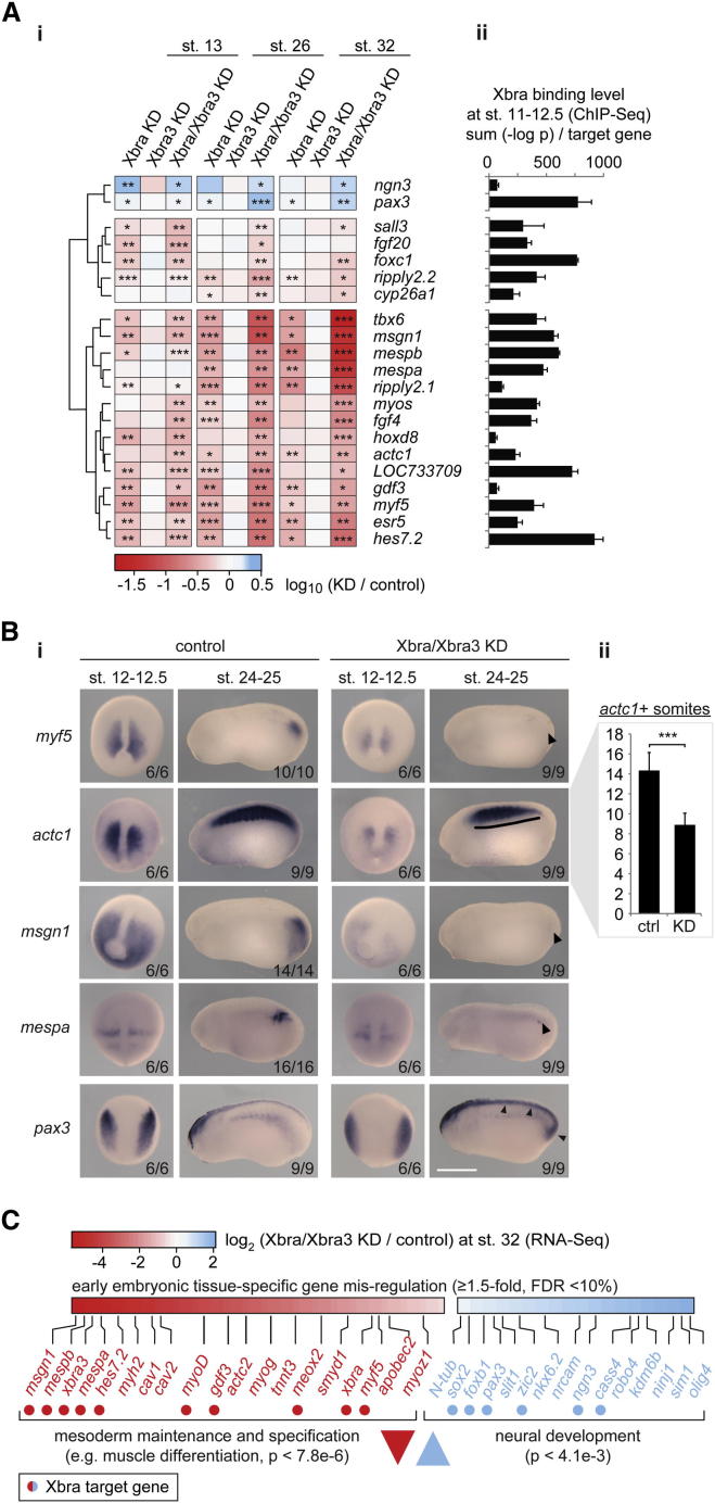 Figure 2. Brachyury Paralogues Xbra and Xbra3 Balance Mesodermal over Neural Fate and Prime Mesoderm for Differentiation(A) Differential expression profile (n = 3) of Xbra target genes. Transcriptional fold changes upon Xbra, Xbra3, or Xbra/Xbra3 KD determined at stage 13 (neurula), 26 (midtail bud), and 32 (early tadpole) by RT-qPCR (i), logarithmized, clustered, and visualized as heat map. Gene-associated total Xbra binding levels (ii) detected at stages 11â12.5 (gastrula) by ChIP-seq (n = 2).(B) WMISH (i) of control and Xbra/Xbra3 KD embryos for selected Xbra target genes at stages 12â12.5 (late gastrula) and 24â25 (midtail bud). Arrowheads and line indicate loss of posterior mesoderm (myf5, msgn1, mespa), formation of irregular, anterior somites (actc1), and ectopic or elevated expression within tail bud and dorsal nervous system (pax3). The scale bar represents 0.5 mm. (ii) Number of actc1+ somites formed by stage 24 and 25 in control and Xbra/Xbra3 KD embryos (n = 9).(C) Tissue-specific Gene Ontology (GO) term analysis of differentially expressed genes (â¥1.5-fold; FDR < 10%) in transcriptome-wide study of control and Xbra/Xbra3 KD embryos at stage 32. Statistical significance (p) according to Mann-Whitney U test using PANTHER classification system (Mi et al., 2010).All error bars, SD of indicated biological replicates (n). â¥1.5-fold transcriptional misregulation: â, FDR < 10%; ââ, FDR < 1%; âââ, FDR < 0.1%. See also Figures S2, S3, and S4 and Table S2. |