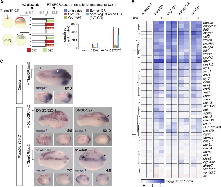Figure 5. Eomes, VegT, and Xbra Can Activate Directly the Same T-box TF-dependent Target Genes(A) Animal cap (AC) assay to detect direct regulation (i.e., in the presence of chx) of gene transcription by RT-qPCR using dex-inducible fusion constructs (Xbra-GR, VegT-GR, Eomes-GR) individually or in combination (3xT-GR). Data normalized to gapdh and the uninduced sample (−dex). The error bars represent SD of biological duplicates.(B) Heat map representation of clustered transcriptional response ratios (+dex/−dex) of T-box TF target genes to the activity of T-box TFs with (−chx) or without (+chx) de novo protein synthesis.(C) Protein synthesis-independent rescue of msgn1 transcription in the tail bud (arrowheads) of Xbra/Xbra3-depleted embryos (stages 22–23) by activated Xbra-GR, whose RNA was unilaterally injected together with lacZ lineage tracer RNA. |