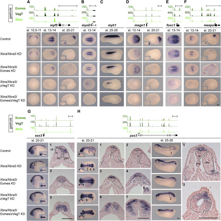 Figure 6. Combined Loss of Eomes, VegT, and Xbra Reveals Their Collaboration to Determine Neuromesodermal Bipotency and Promote Mesodermal Differentiation during Axial ElongationGastrula-staged snapshots of Eomes, VegT, and Xbra binding near mesoderm-specific genes myf5, myoD, msgn1, foxc1, mespa (A, B, and DâF), and neurogenic genes sox3 and pax3 (G and H). WMISH on control and indicated KD embryos for target genes (A, B, and DâH) and muscle-specific differentiation marker myosin heavy chain 1, myh1 (C). Cross-sections at positions of sox3 and pax3 WMISH as indicated. no, notochord; nt, neural tube (d, dorsal; v, ventral); hm, hypaxial muscle; pm, paraxial mesoderm; sm, skeletal muscle. The scale bar represents 0.2 mm. See also Figures S6 and S7. |