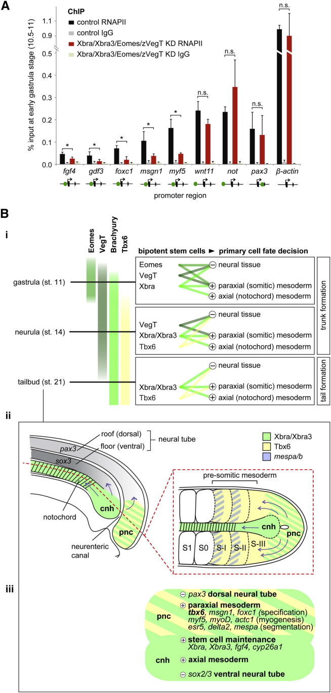 Figure 7. T-box TF-Dependent Recruitment of RNAPII and Model for the Way in which Stage-Dependent Combinations of T-box TFs Define and Instruct Bipotential Stem Cells to Be Recruited to Neural and Mesodermal Tissues and Prime Mesoderm for Differentiation(A) RNAPII deposition at promoters of mesodermal (fgf4, gdf3, foxc1, msgn1, myf5, wnt11, not), neural (pax3), and house-keeping (β-actin) genes in control and T-box TF-depleted embryos at early gastrula stage (10.5–11) determined by ChIP-qPCR. Proximal or distal (upstream or intronic) binding of T-box TFs to indicated gene promoter is symbolized with green dot. The error bars represent SD of biological triplicates. Two-tailed Student’s t test: ∗p < 0.1; n.s., not significant (p ≥ 0.1). IgG, immunoglobulin G.(B) Model: (i) The different spatial and temporal patterns of T-box TFs cause neuromesodermal stem cells to be defined by Eomes, VegT, and Xbra during gastrulation; VegT, Xbra, Xbra3, and Tbx6 during neurulation; and Xbra, Xbra3, and Tbx6 during tail bud stages. These combinations of T-box TFs also ensure that the correct ratio of mesodermal over neural tissue is formed during trunk and tail formation by activating mesoderm-specifying genes and repressing neurogenic genes. The development of axial (notochord) mesoderm depends mainly on Xbra/Xbra3, due to their exclusive expression among these T-box TFs in the chordoneural hinge and developing notochord. Other mesodermal derivatives, such as heart, may similarly depend on combinations of T-box TFs (omitted from model). (ii) Schematic diagram of a sagittal section and a horizontal section (red dashed line) through the posterior region of an early tail bud embryo illustrating the expression of Xbra/Xbra3, Tbx6, and mespa/b and the recruitment of mesodermal and neural cells (blue arrows) from the stem niche (chordoneural hinge and posterior wall of the neurenteric canal). Most cells of the chordoneural hinge give rise to the notochord and the ventrolateral horns of the neural tube, whereas cells in the posterior wall of the neurenteric canal contribute to paraxial (presomitic) mesoderm and the dorsal roof of the neural tube. cnh, chordoneural hinge; pnc, posterior wall of neurenteric canal; S1, first somite; S0, newly forming somite; S-I/II/III, presomitic mesoderm. (iii) Genetic regulatory inputs of T-box TFs in early tail bud embryos with several functional nodes being active in different domains (cnh, pnc) of the tail bud: stem cell maintenance; specification of somitic mesoderm; myogenic differentiation; patterning of presomitic mesoderm; notochord formation; and protection from neuralization. |