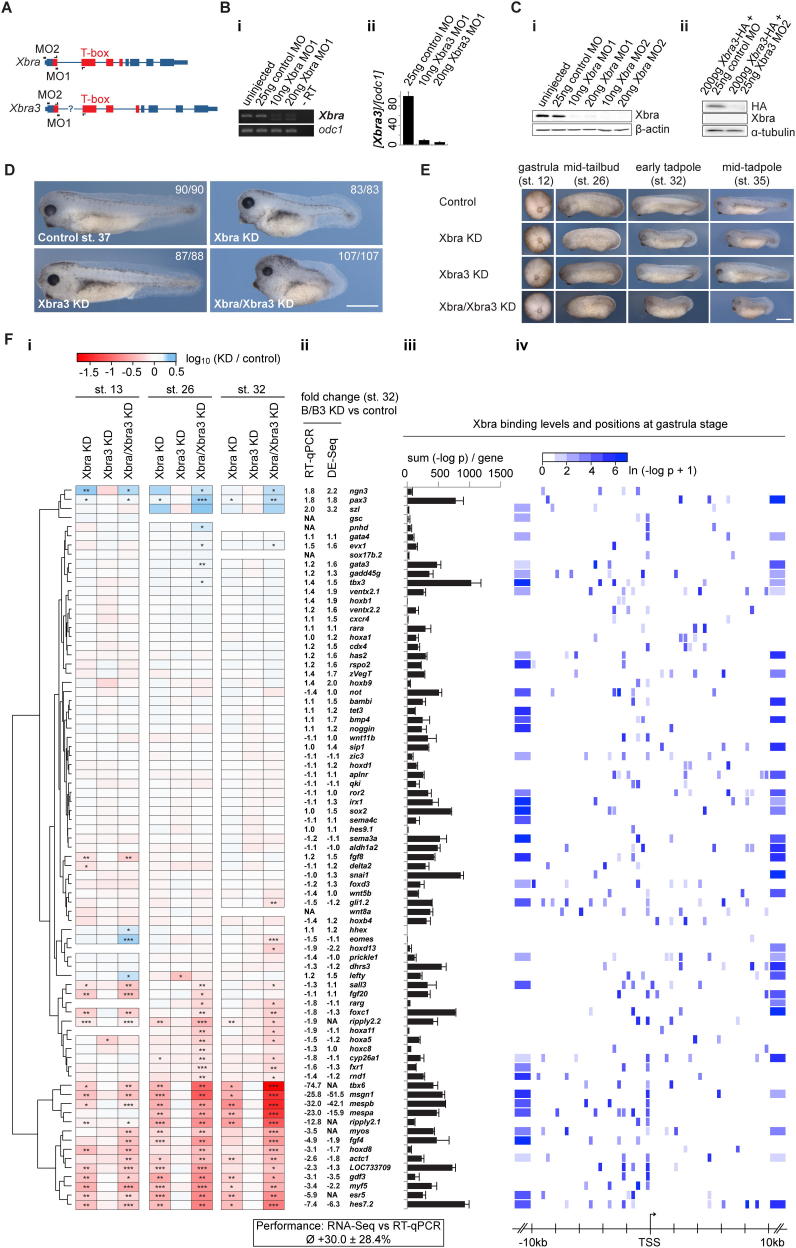Figure S2. Transcriptional Misregulation of Xbra Target Genes Induced by the Single and Combined Knockdown of Xbra and Xbra3 Suggests Functional Redundancy between these Brachyury Paralogues and Reflects the Severity of Corresponding Phenotypes, Related to Figure 2(A) Genomic architecture of Xbra and Xbra3 in X. tropicalis including the position of the T-box within the first four exons (red). Black bars, position of splice- (MO1) and translation-blocking (MO2) morpholinos. Black âfish-hookâ arrows, position of PCR primers used to assess the efficiency of MO1. The length of the first intron of Xbra3 is unknown because of a sequencing gap in the genome (JGI4.1).(B) Efficiency of blocking splicing of Xbra (i) and Xbra3 (ii) by the injection of corresponding MO1 at stage 10.5 (Xbra) and 12 (Xbra3). In contrast to 25 ng control MO, 10 or 20 ng Xbra MO1 caused cryptic splicing, which created multiple bands by diagnostic RT-PCR (i). odc1, loading control. -RT, PCR without reverse transcription. Efficiency of disrupting correct splicing of Xbra3 was quantified by RT-qPCR taking into account melting curves to discriminate wild-type from cryptic templates. Compared to 25ng control MO, 10 or 20 ng of Xbra3 MO1 reduced wild-type splicing to about 5%â10% (ii). Relative concentrations of Xbra3 were normalized with odc1. Error bars, s.d. of biological duplicates.(C) Semiquantitative immunoblotting of endogenous Xbra protein levels at stage 11 upon injection of MO1 or MO2 at different doses (10 and 20 ng) compared to controls (uninjected and injected with 25 ng control MO) (i). Loading control, β-actin. Synthesis of 200 pg Xbra3-HA was inhibited in vivo by Xbra3 MO2 compared to control MO (ii). ChIP-grade Xbra antibody did not recognize Xbra3-HA. Loading control, α-tubulin.(D) The embryo was consistently truncated along its antero-posterior axis, more strongly by the double Xbra/Xbra3 knock-down (KD) than the single Xbra KD. No defects were observed for Xbra3 KD embryos. By tadpole stage, Xbra/Xbra3 morphants were severely truncated to the extent that the tail was hardly elongating. Statistics given here in the top right corner of every picture were from one single experiment recorded at stage 37. Scale bar, 0.5 mm.(E) Developmental time course of embryos injected with MO1 and MO2 (5 ng each) to knock down Xbra and Xbra3 individually and simultaneously. Scale bar, 0.5 mm.(F) Clustered differential expression profile (Xbra, Xbra3 and Xbra/Xbra3 KD versus control) for some Xbra target genes: (i) Transcriptional fold changes induced by the KD of Xbra, Xbra3 or Xbra/Xbra3 were determined at stage 13 (early neurula), 26 (mid-tailbud) and 32 (early tadpole) by RT-qPCR (n = 3), logarithmised, clustered and visualized as a heat map (red, downregulated; blue, upregulated). ⥠1.5-fold transcriptional mis-regulation: â, FDR < 10%; ââ, FDR < 1%; âââ, FDR < 0.1%. (ii) If available, the fold change of transcription is indicated for Xbra/Xbra3 (B/B3) KD compared to control embryos at stage 32 calculated by RT-qPCR and RNA-Seq/DESeq (DE-Seq). Floating-point numbers preceded by a minus symbol indicate a downregulation. NA indicates that differential expression data could not be obtained from the RNA-Seq experiment since the transcriptome assembly (JGI4.1) used for the alignment did not contain the sequences for esr5, myos, ripply2.1, ripply2.2 and tbx6. Differential expression data was subsequently complemented with these missing genes. A comparison of 70 genes indicated that RNA-Seq followed by DESeq (Anders and Huber, 2010) resulted in an average 30% (s.d. +/â28.4%) greater positive fold change than RT-qPCR. (iii, iv) Xbra binding levels and positions per selected target gene at gastrula stage. (iii) Quantification of binding per target gene (sum [-log p]). Error bar, s.d. of biological duplicates. (iv) Xbra binding pattern closest to selected target genes. DNA occupancies were binned at 400-bp intervals between 10 kb up- and downstream from the corresponding TSS. Beyond this range Xbra binding events were collected into single bins. DNA occupancy was visualized as a heat map according to the natural logarithm (ln) of [-log p + 1]. |