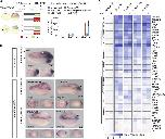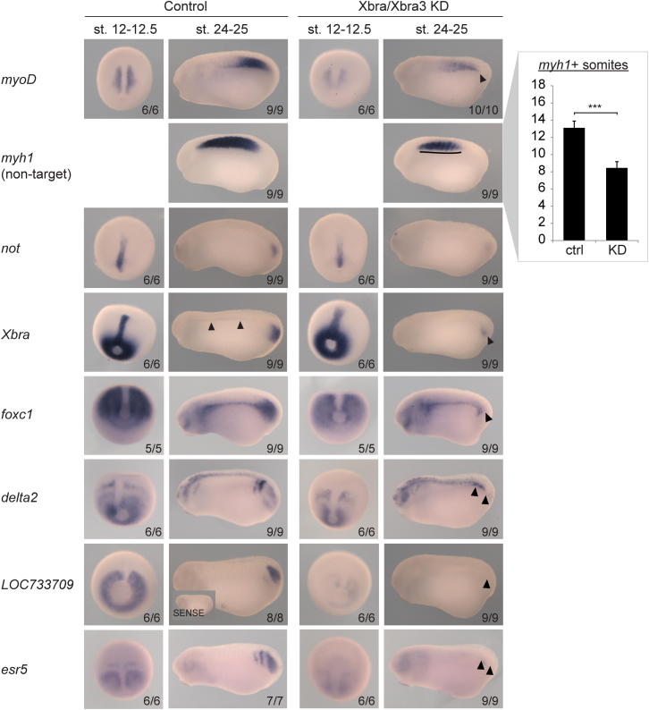 Figure S3. Transcriptional Misregulation of Xbra Target Genes Induced by the Combined Knockdown of Xbra and Xbra3 Affects Posterior Mesoderm Development, Related to Figure 2WMISH on control and Xbra/Xbra3 KD embryos at late gastrula (stage 12-12.5) and mid-tailbud (24-25) stage for several Xbra target genes (myoD, not, Xbra, foxc1, delta2, LOC733709 and esr5) and muscle differentiation marker myh1. Arrowheads and line indicate loss of posterior mesoderm development (myoD, not, Xbra, foxc1, delta2, LOC733709 and esr5) and formation of irregularly shaped, anterior somites (myh1) upon Xbra/Xbra3 KD. Number of myh1+ somites (n = 9) formed by stage 24-25 plotted for control and Xbra/Xbra3 KD embryos (error bar, s.d.; two-tailed Student’s t test: ∗∗∗p < 0.001). The sense probe of the uncharacterized gene LOC733709 did not produce any staining as shown on a mid-tailbud embryo. Statistics in bottom right corner indicate the number of embryos observed with the depicted WMISH pattern versus the number of embryos analyzed in total. Views: stage 12-12.5, dorso-posterior; stage 24-25, lateral, posterior end to the right. Scale bar, 0.5 mm. |