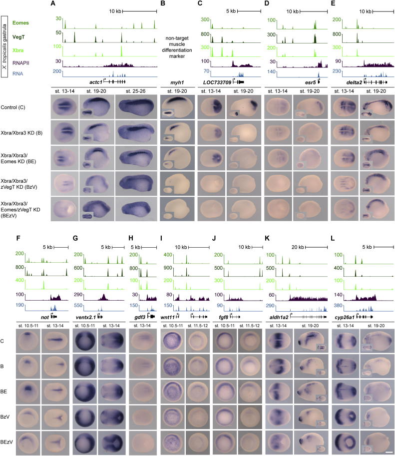Figure S6. Combined Loss of T-box TFs Abrogates Neuromesodermal Bipotency, Paraxial Mesoderm Development, and other Mesoderm-Associated Developments, Related to Figure 6Gastrula-staged snapshots of Eomes, VegT and Xbra binding nearby actc1 (A), LOC733709 (C), esr5 (D), delta2 (E), not (F), ventx2.1 (G), gdf3 (H), wnt11 (I), fgf8 (J), aldh1a2 (K) and cyp26a1 (L). RNAPII and poly(A) RNA transcript profiles are taken from Akkers et al. (2009). WMISH on control, Xbra/Xbra3, Xbra/Xbra3/Eomes, Xbra/Xbra3/zVegT and Xbra/Xbra3/Eomes/zVegT KD embryos for target genes (A),(C)-(L) and the muscle-specific differentiation marker myosin heavy chain 1 (myh1) (B) at distinct developmental stages. Early (stage 10.5-11) and late (stage 11.5-12) gastrula, vegetal view; early neurula (stage 13-14), dorsal view; early tailbud (stage 19-20), lateral view (small image, dorsal view); mid-tailbud (stage 25-26), lateral view; embryos from stage 13-20, posterior to the right. Scale bar, 0.5 mm. |