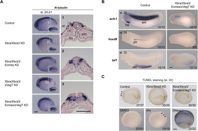 Figure S7. Combined Loss of T-box TFs Causes Embryos to Produce Excess Neural Tissue at the Expense of Axial and Paraxial Mesoderm and in the Absence of Apoptosis, Related to Figure 6(A) WMISH on control, Xbra/Xbra3, Xbra/Xbra3/Eomes, Xbra/Xbra3/zVegT and Xbra/Xbra3/Eomes/zVegT KD embryos for neural differentiation marker N-tubulin at early tailbud stage (stage 20-21, lateral view). 1, 2 and 3 mark the position of cross-sections through control, Xbra/Xbra3 KD and Xbra/Xbra3/zVegT KD embryos. Abbreviations: no, notochord; nt, neural tube (d, dorsal; v, ventral); pm, paraxial mesoderm.(B) WMISH for actc1, hoxd8 and tal1 at late tailbud stage illustrates the loss of mesodermal derivatives such as skeletal muscle (sm), heart (he), pronephros (pn) and ventral blood island (vbi) upon Xbra/Xbra3/Eomes/zVegT KD. Statistics in bottom right corner indicates the number of embryos observed with the depicted WMISH pattern versus the number of embryos analyzed in total.(C) TUNEL staining on control, Xbra/Xbra3 and Xbra/Xbra3/Eomes/zVegT KD embryos (cleared with Murrayâs clear) at early tailbud stage (stage 20). Positive controls, embryos treated for 4 hr in 35 μM cycloheximide (chx) and fixed embryos incubated with DNase I. Arrowheads mark apoptotic cells in the brain region (where apoptosis can occasionally be observed in embryos even under normal conditions) and the posterior nervous system induced by cycloheximide.Scale bar, 0.2 mm. |