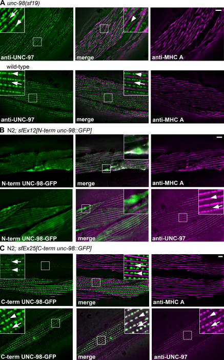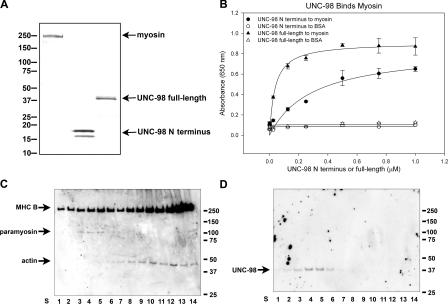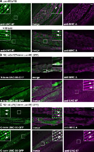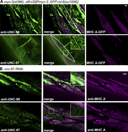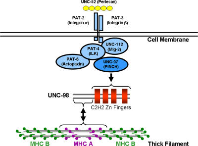 Focal adhesions are multiprotein assemblages that link cells to the extracellular matrix. The transmembrane protein, integrin, is a key component of these structures. In vertebrate muscle, focal adhesion-like structures called costameres attach myofibrils at the periphery of muscle cells to the cell membrane. In Caenorhabditis elegans muscle, all the myofibrils are attached to the cell membrane at both dense bodies (Z-disks) and M-lines. Clustered at the base of dense bodies and M-lines, and associated with the cytoplasmic tail of beta-integrin, is a complex of many proteins, including UNC-97 (vertebrate PINCH). Previously, we showed that UNC-97 interacts with UNC-98, a 37-kD protein, containing four C2H2 Zn fingers, that localizes to M-lines. We report that UNC-98 also interacts with the C-terminal portion of a myosin heavy chain. Multiple lines of evidence support a model in which UNC-98 links integrin-associated proteins to myosin in thick filaments at M-lines.