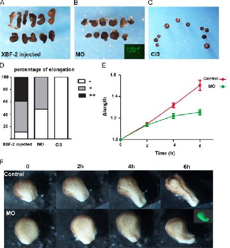 Fig. 6. Downregulation of Calpain2 expression by MO inhibits neural convergent extension. (A�C) Neural convergent extension was analysed in XBF2-injected animal caps. One-cell stage embryos were injected with 100 pg XBF2 either alone (A) or co-injected with 70 ng MO (B) or treated with 50 �M CI3 (C). The inset in B shows MO localisation in the explants as shown by FITC fluorescence. (D) Percentage of elongated explants from the experiment described in A�C. Explants with different degrees of elongation were grouped according to their length to width ratio (LWR). Black indicates a strong elongation (LWR>2), grey a mild elongation (LWR=1.2�2) and white no elongation (LWR=1�1.2). (XBF-2 injected, n=26; MO, n=23; CI3, n=24). (E�F) Neural convergent extension was analysed in neural plate explants. (F) Neural plate explants excised from stage 12�12.5 control (top panel) or MO-injected (bottom panel) embryos were left to elongate. The time (in hours) at which each picture was taken is indicated above. The inset of the last image in the bottom panel shows FITC fluorescence. (E) The graph shows the change in length (Δlength) over time in control (red) and MO-injected (green) neural explants that were prepared as in (F). The lengths were measured using ImageJ software. The plotted data are means�s.e.m (n=10). Abbreviations: LWR, length to width ratio. |