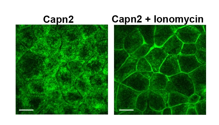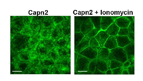 Suppl. Figure3. Calpain 2 localisation is dependent on intracellular Ca2+ concentration. Animal cap cells of stage 9 embryos injected with 400pg HA-Capn2. In embryos treated for 40 min with 10μΜ Ionomycin, Capn2 localises at the membrane whereas it is diffused in the cytoplasm in untreated embryos. Scale bar = 20μM. |
