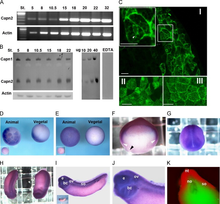 Fig. 1. Calpain2 temporal and spatial expression patterns during Xenopus development. (A) RT-PCR was performed using specific primers for Calpain2 at different stages of development. Actin was used as a loading control. (B) Casein zymography analysis was performed as described under Materials and Methods and shows the activity of Calpain1 (upper band) and Calpain2 (lower band) at different stages of development (left top gel). Western blot of actin was used as a loading control (left bottom gel). Various amounts (10�40 �g) of whole-embryo lysates were loaded on to the gel to assess the method sensitivity (middle gel). As a negative control, a gel loaded with 20 �g of lysate was incubated in a noncalcium proteolysis buffer containing 1 mM EDTA (right gel). (C) HA-Calpain2 localisation. (I) Cross-section through the dorsal mesoderm of a stage 12 embryo ectopically expressing HA-Calpain2 and stained with an anti-HA antibody. A high-magnification view of the boxed region is shown in the inset. The white arrow indicates the presumptive Golgi�ER complex. (II) HA-Calpain2 localisation in ectodermal cells of a stage 9 embryo. (III) HA-Calpain2 localisation in neural ectodermal cells of a stage 13 embryo. Scale bars=20 μΜ. (D�K) Expression pattern of Calpain2 in Xenopus by WISH. (D) Animal (left) and vegetal (right) view of a stage 5 embryo. Control hybridisation with the sense probe is shown in the inset. (E) Animal (left) and vegetal (right) view of a stage 9 embryo. Control hybridisation with the sense probe is shown in the inset. (F) Sagittal section of a stage 10.5 embryo, apical to the top, dorsal to the left. Black arrow: blastopore lip. White arrows: Mesodermal staining. (G) Dorsal view of a stage 17 embryo, anterior to the bottom. (H) Dorsal (left) and lateral (right) view of a stage 22 embryo, anterior to the bottom. (I�K) Stage 30 embryos. (I) Lateral view, anterior to the left, dorsal to the top. Control hybridisation with the sense probe is shown in the inset. (J) High magnification view of anterior region. (K) Cross-section view, dorsal to the top, of a WISH-stained tailbud embryo visualised by fluorescent microscopy (WISH-staining in red; background fluorescence in green). Abbreviations: e, eye; ov, optic vescicle; bc, branchial arches; so, somites; no, notochord; nt, neural tube. |