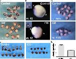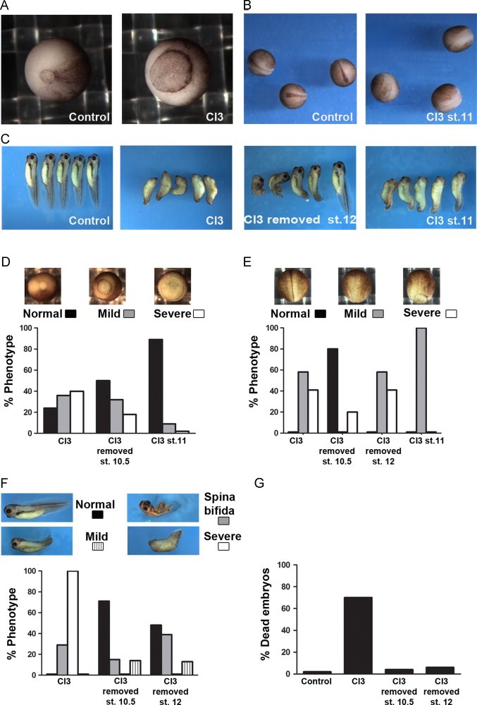 Fig. 2. Inhibition of Calpains by CI3 causes severe delays in blastopore and neural tube closures. (A) Vegetal view of a stage 12 control embryo (left) and an embryo treated with 100 �M CI3 from pre-gastrula stages (right). CI3-treatment severely delays blastopore closure. (B) Dorsal view of stage 18 control embryos (left) and embryos treated with 100 �M CI3 from stage 11 (right). The addition of the inhibitor at this stage causes a significant delay in neural tube closure. (C) Tailbuds of embryos treated with CI3 at different times of development and rescued by removal of the inhibitor. Embryos in which the inhibitor was added at pre-gastrula stages and kept for the whole course of development display a severe phenotype, with shorter and bent AP axes and loss of anterior structure (second image from the left). Embryos in which the inhibitor was removed at stage 12 and replaced with fresh 0.1� MMR display a range of overall less severe phenotype, with normal heads but shorter and bent AP axes and some spina bifida phenotypes (third image from the left). Embryos treated with CI3 from stage 11 onwards appear shorter, with reduced eyes and overall pigmentation (image to the right). (D�F) Scoring of the phenotypes of embryos treated with the inhibitor from gastrula stages onwards (n=73), inhibitor removed at stage 10.5 (n=44), inhibitor removed at stage 12 (n=55) and treated from stage 11 (n=46). Graphs indicate the per cent of embryos that display the phenotypes as depicted in the images above each graph. Percentages are calculated on surviving embryos only. (D) Delays in blastopore closure are assessed in embryos at stage 12. Controls: blastopore=0.2�0.25 mm, Mild phenotype: blastopore=0.35�0.5 mm. Severe phenotype: blastopore=0.5�0.8 mm. (E) Delays in neural tube closure are scored in embryos at stage 18. (F) The range of phenotypes observed at tailbud stages are classified in mild (normal head structure, shorter AP axis), severe (short and deformed embryos, completely lacking head structures) and spina bifida. (G) Death rates of embryos treated with CI3 from gastrula stages onwards, inhibitor removed at stage 10.5 and at stage 12. |