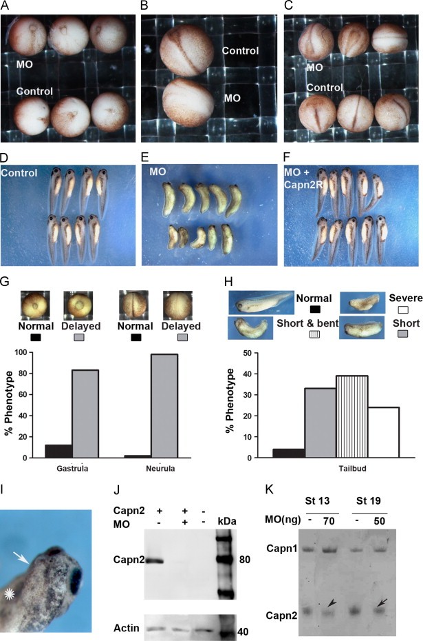 Fig. 3. Calpain2 downregulation by morpholino antisense oligonucleotide (MO) leads to mild delays in blastopore closure and severe defects during neural morphogenesis. (A) Vegetal view of stage 12.5 control embryos (bottom) and embryos injected with 70 ng MO at 1-cell stage (top). MO-injected embryos show mild delays in blastopore closure (blastopore of controls embryos=0.2�0.25 mm; blastopore of MO-injected embryos=0.35�0.5 mm). (B) Dorsal view of a stage 18 control embryo (top) and an embryo injected with 70 ng MO at 1-cell stage (bottom). The MO-injected embryo show marked delays in neural tube closure. (C) Dorsal and anterior views of stage 20 embryos injected with the MO as in B. At this stage, dorsal neural folds appear to be fused in the MO-injected embryos (top, third embryo to the right) as in controls (bottom, embryo in the middle). However, anterior neural tube is still open in MO-injected embryos (top, first and second embryos from the left) whereas it is completely closed in controls (bottom, first and third embryos). (D�F) Tailbuds of control embryos (D), embryos injected with 70 ng MO at 1-cell stage (E) and embryos in which the same amount of MO was co-injected with 500 pg Capn2R (F). MO injections cause shortening of the AP axis and head malformations (E) and this phenotype is successfully rescued by Capn2R(F). (G) Delays in blastopore closure and during neurulation are scored in embryos (injected as in A) at stage 12 and 18, respectively (n=71). Graphs indicate the percentage of embryos that display the phenotypes as depicted in the images above each graph. (H) Tailbuds of embryos injected with the MO as in A are scored for their phenotypes. They were classified in short (shorter AP axes), short and bent (shorter and dorsally curved AP axes) and severe (short and deformed embryos, completely lacking head structures). Graphs indicate the percentage of embryos that display the phenotypes as depicted in the images above each graph (n=46). (I) Dorsal view of the head of a tailbud injected with 15 ng MO at 1 out of 2 blastomeres. Loss of the eye structures (arrow) and reduced pigmentation are observed in the injected side (indicated by an asterisk). (J) Western blot analysis detecting HA-tagged Capn2 in lysates of stage 13 embryos. mRNA (200 pg) encoding HA-Capn2 is co-injected with or without MO (50 ng). This amount of MO completely blocks the translation of HA-Capn2. (K) Casein zymography analysis showing endogenous Calpain1 (top) and Calpain2 (bottom) activities in lysates of MO-injected embryos. Injection of 50 ng MO causes a 40% reduction in Calpain2 expression at stage 19 (arrow). Injection of 70 ng MO causes a 50% reduction in Calpain2 expression at stage 13 (arrowhead). Densitometry analysis was performed using ImageJ software and the samples were corrected for loading in correlation with Capn1 |