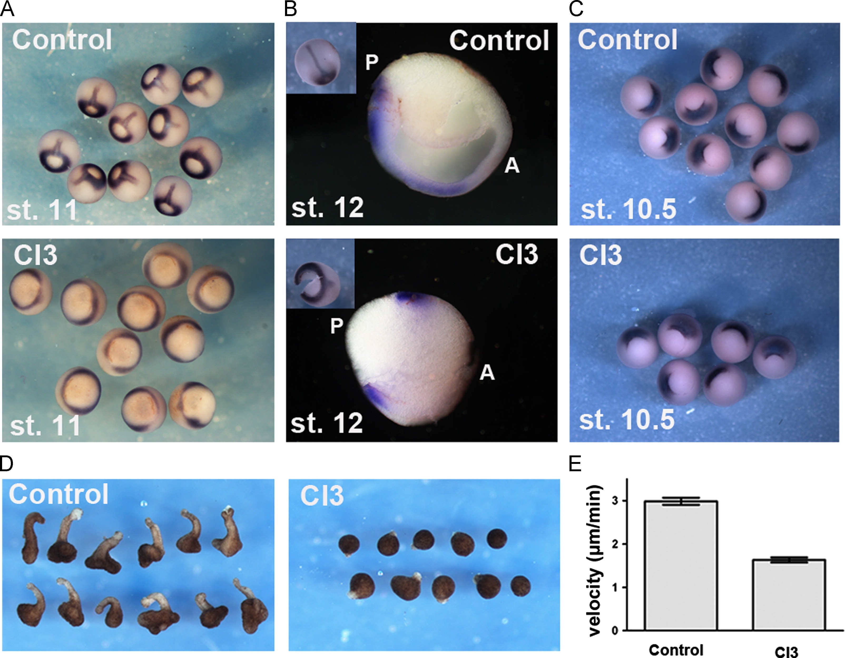 Fig. 4. Calpain inhibition by CI3 completely blocks mesoderm convergent extension and affects mesoderm migration without altering cell fate. (A�C) WISH showing the expressions of mesodermal markers Xbra (A and B) and Chrd (C) in embryos treated with CI3 from 2-cell stage onwards. Inhibition of Calpains does not affect the expression and localisation of Xbra and Chrd at early gastrula stages (A and C). (B) Sagittal sections of Xbra-stained embryos at stage 12 showed a shorter notochord in CI3-treated embryos compared to controls. (D) A 50 �M CI3 inhibitor completely blocks the activin-induced elongation of animal caps explants in 3 independent experiments. (E) Migration rates of CI3-treated or untreated mesodermal cells derived from activin-treated dissociated caps (values shown are means�s.e.m., n=25). Abbreviations: A, anterior: P, posterior. |