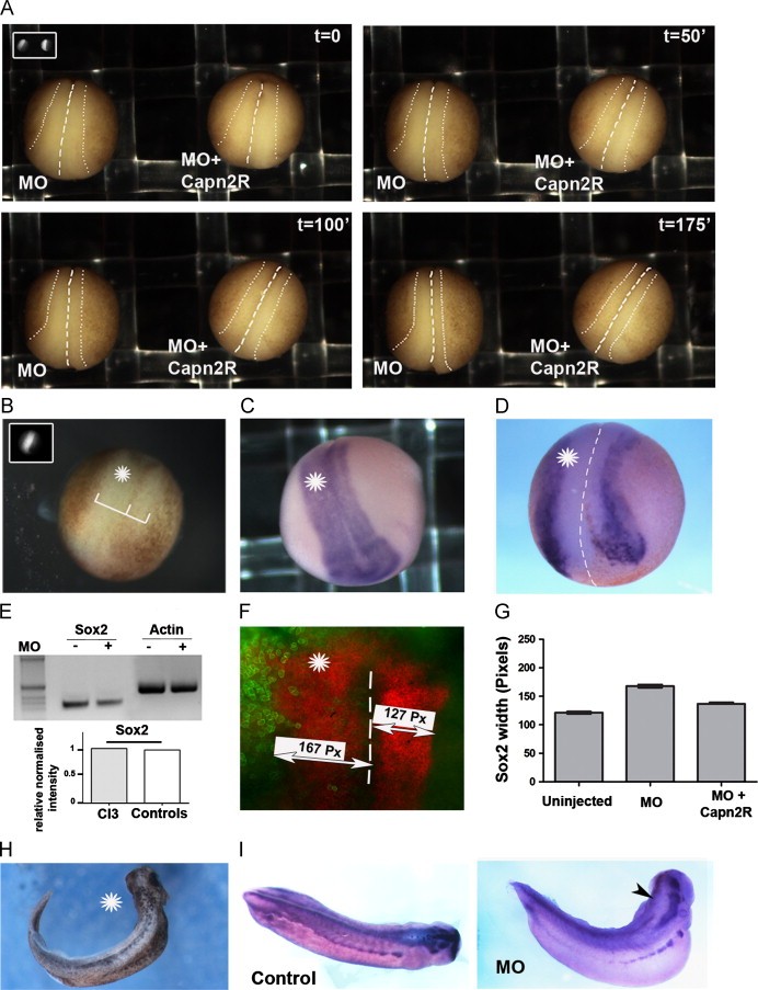 Fig. 5. Downregulation of Calpain2 by MO affects cell movements during neural tube closure. (A) Frames from a 175 min time-lapse movie of an embryo injected at 1 out of two blastomeres with 30 ng MO (left embryo in each frame) and an embryo in which the same amount of MO was co-injected with 300 pg Capn2R mRNA (right embryo in each frame). White dashed lines outline the width of the neural plate. Time (t) in minutes is shown at the top right of each frame. The injected side of the embryo is shown by FITC fluorescence in the top left inset in the first frame. The severe delay in neural plate movement caused by MO injection is successfully rescued by Capn2R. (B) Targeted injection of 20 ng MO at 1 dorsal blastomere at 4-cell stage is sufficient to cause the severe delay in neural plate movement. The injected side is visualised by FITC fluorescence (inset) and indicated by an asterisk. White lines show the width of the neural plate. (C) WISH for neural marker Sox2 in a stage 16 embryo co-injected with 20 ng MO and 50 pg mGFP at 1 dorsal blastomere at 4-cell stage. The injected side is determined as described in F and it is marked by an asterisk. Sox2 expression is wider in the MO-injected side. (D) WISH for the neural fold marker Pax3 in a stage 18 embryo injected as in C. The injected side is marked by an asterisk. Pax3 expression is shifted laterally in the MO-injected side. (E) RT-PCR analysis shows that Sox2 expression is not affected by MO-injection in XBF2-induced animal caps. Sox2 expression levels have been calculated using ImageJ and normalised against the loading control. (F) High magnification of the neural plate of a Sox2-stained embryo injected as in C and subsequently stained with an anti-GFP antibody and visualised by fluorescent microscopy. mGFP staining (green) identifies the injected side (asterisk). Sox2 staining is shown in red. The width of Sox2 staining is measured using ImageJ software. (G) Quantification of the width of Sox2 expression. The width was measured as described in F. As shown by the graph, the width of Sox2 expression is significantly wider in the MO-injected sides than in the uninjected ones. Co-injection with 250 pg Capn2R clearly rescues the phenotype (values shown are means�s.e.m., n=15). (H) Tailbud of an embryo injected with MO as in B. It presents a lateral bending towards the MO-injected side (indicated by an asterisk), probably due to decreased elongation of this side of the embryo. (I) WISH for the neural fold marker Pax3 in a stage 28 embryo injected with 40 ng MO at both dorsal blastomeres at 4-cell stage. Injection of the MO disrupts anterior neural tube closure (arrow). |