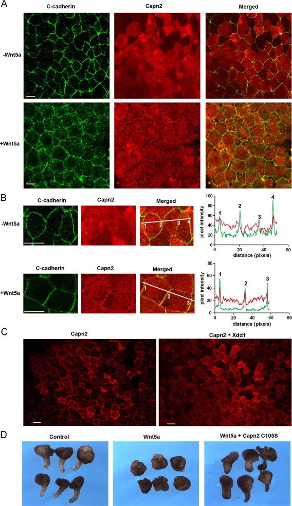 Fig. 8. Wnt5a elicits Calpain2 translocation to the plasma membrane. (A) Animal caps from embryos injected with 200 pg HA-Capn2 alone (top panels) or co-injected with 500 pg Wnt5a (bottom panels) are double stained for C-cadherin (green) and HA-Calpain2 (red). Plasma membrane can be visualised in both top and bottom panels by C-cadherin staining. In the absence of Wnt5a (top panel) Calpain2 is mainly diffused in the cytoplasm, whereas in the presence of Wnt5a there is a clear increase in its membrane localisation. Scale bar=20 μM. (B) Co-localisation studies in individual groups of cells in the absence (top panel) or presence of Wnt5a (bottom panel). Fluorescence-intensity profiles are shown to the right and represent the areas marked by the white line. Numbering represents membrane regions. Only in the presence of Wnt5a C-cadherin and Calpain2 show clear co-localisation at membrane regions, as determined by fluorescence-intensity overlap. Pixel intensity profiles were generated using ImageJ software. Scale bar=20 μM. (C) Ectodermal cells of stage 13 embryos injected with 200 pg HA-Capn2 alone or co-injected with 1 ng Xdd1 stained with anti-HA antibody. Scale bar=20 μM (D) Injection of 100 pg Wnt5a blocks the activin-induced elongation of animal caps explants. Co-injection of 1 ng Capn2 C105S reverses the inhibition of elongation caused by Wnt5a. |