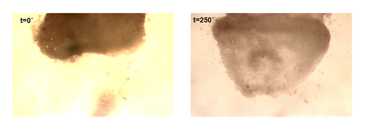 Suppl. Figure2. Radial intercalation is unaffected in Keller explants treated with CI3. Keller explants were excised at stage 10.5. The explants were subsequently plated into fibronectin-coated chambered coverslips in DFA in the prescence of 50μΜ CI3. Still frames from a time lapse movie at 0 and 250 minute, are showing that the mesodermal cells have been successfully radially intercalated towards the substrate. From multiple cell layers, the mesoderm thins and spreads after 250 minutes. |